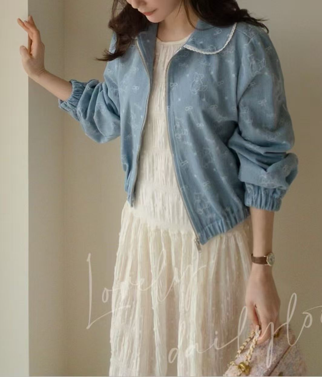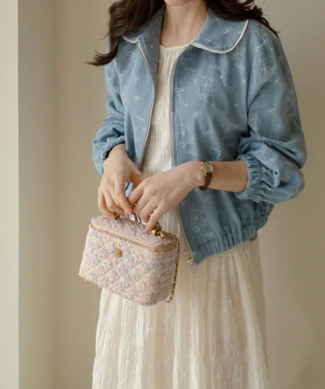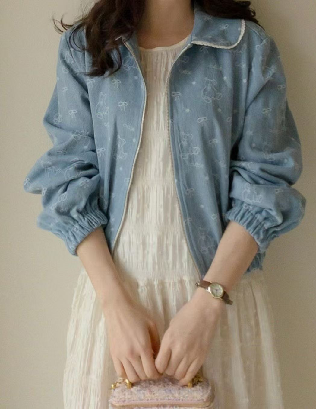 以牛仔感布料結合細緻滿版設計,低調融入小熊與蝴蝶結元素,增添整體的柔和與童趣感。