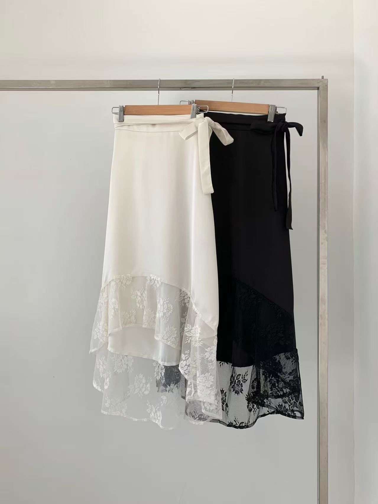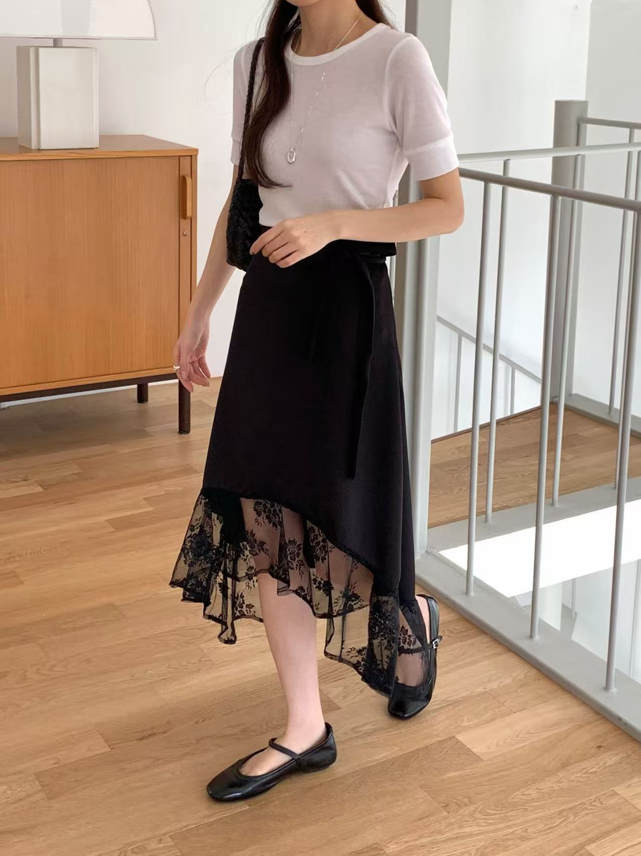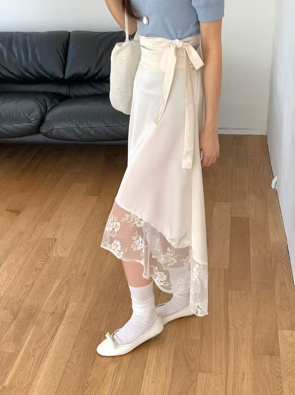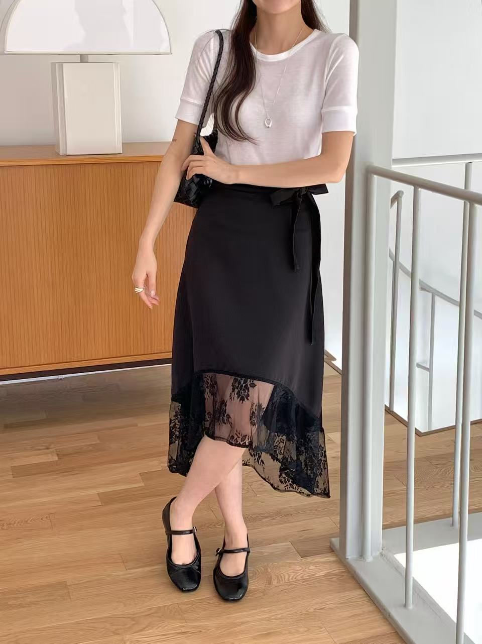 裙擺加入不對稱剪裁與蕾絲拼接細節,在走動時會露出若隱若現的蕾絲花紋,讓整體多了一點優雅與女人味。