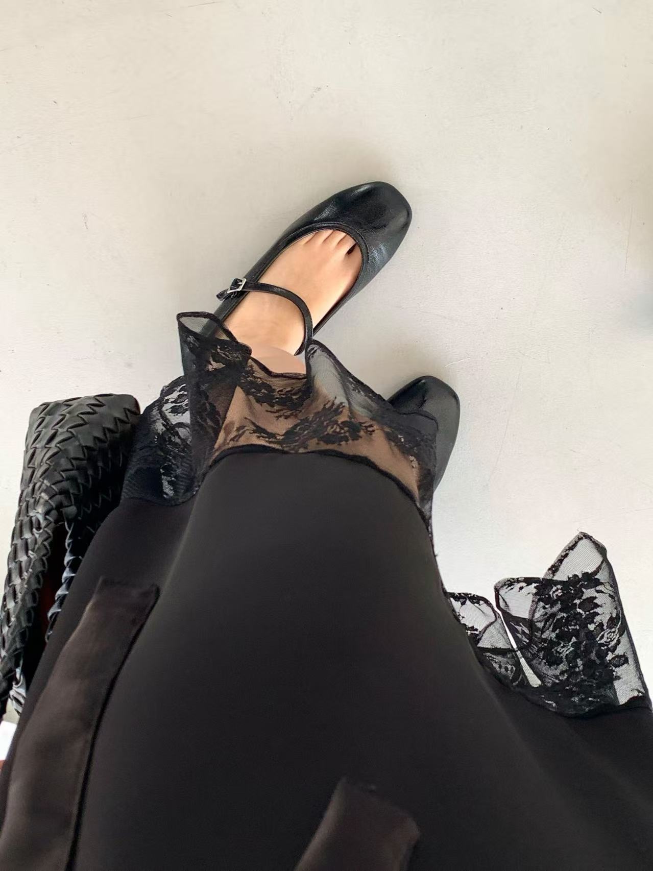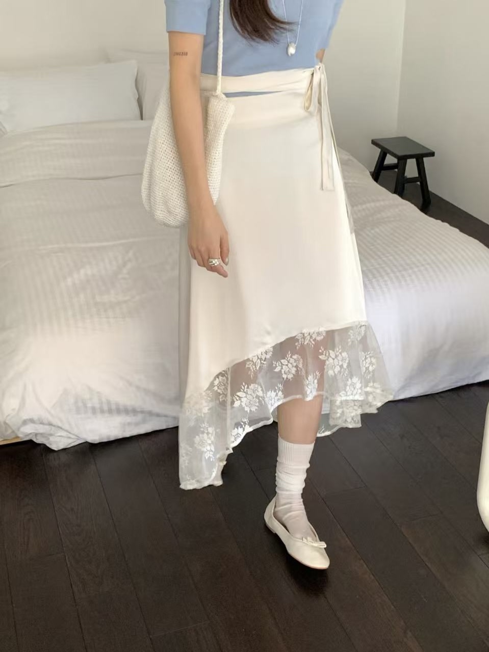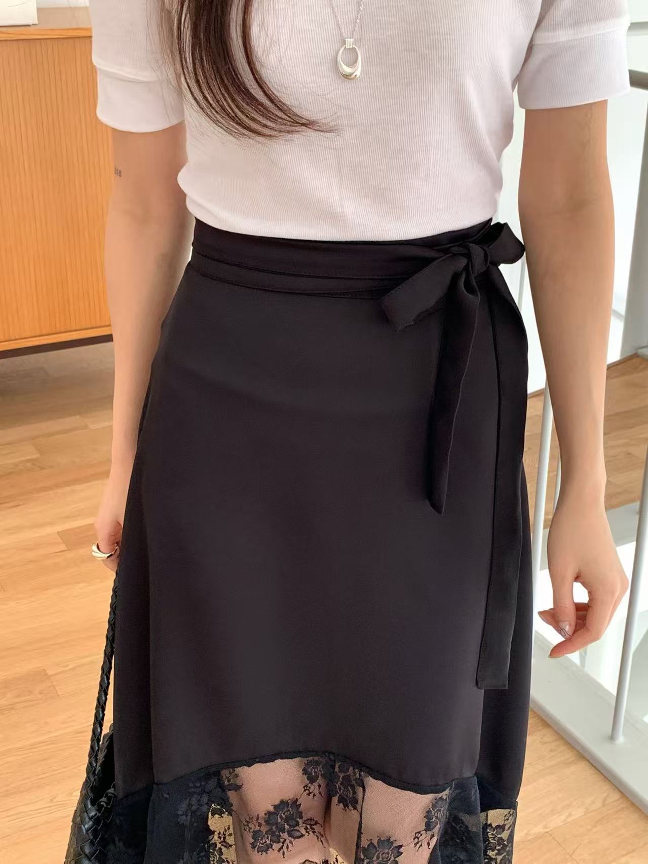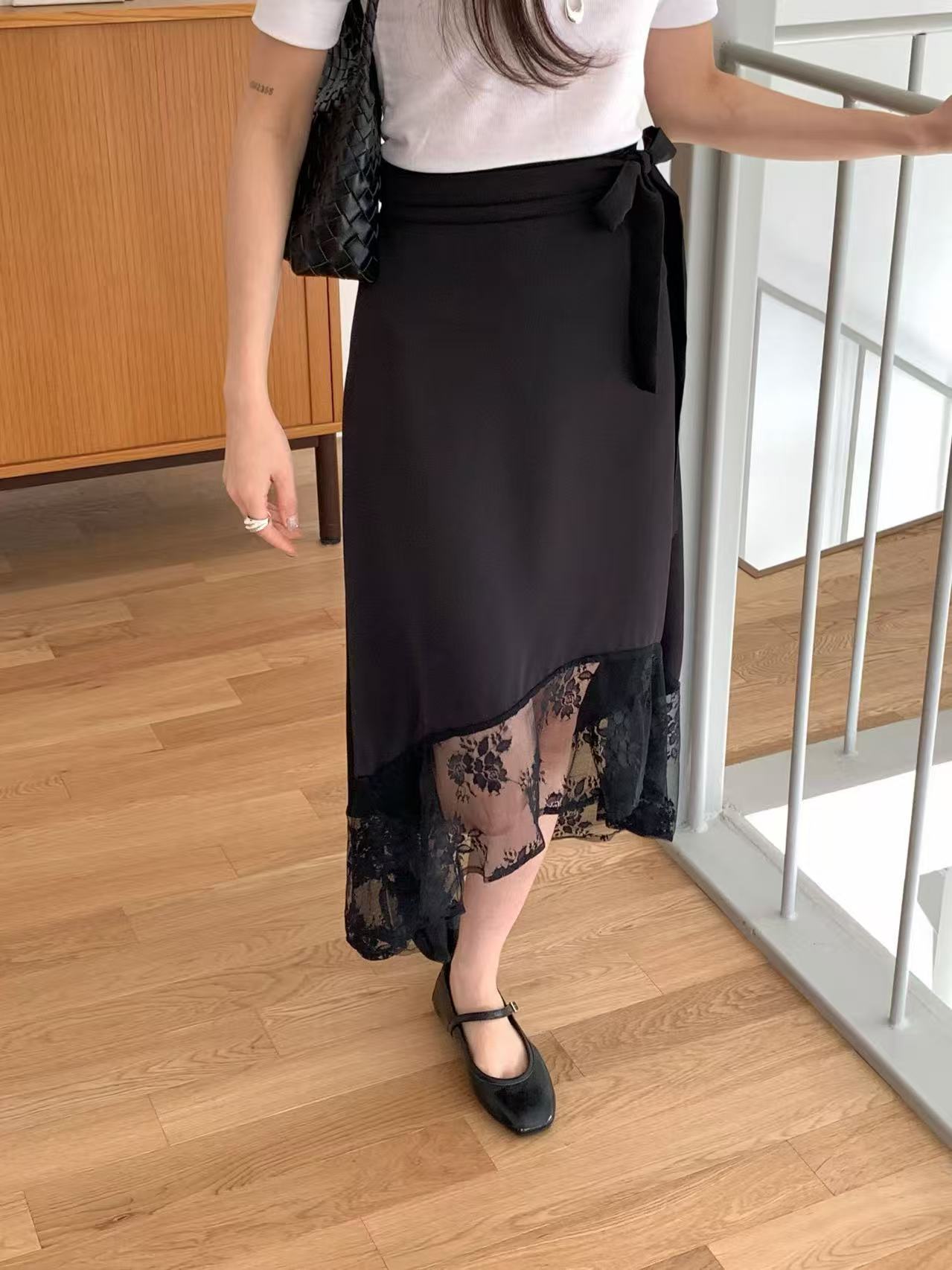 裙擺加入不對稱剪裁與蕾絲拼接細節,在走動時會露出若隱若現的蕾絲花紋,讓整體多了一點優雅與女人味。