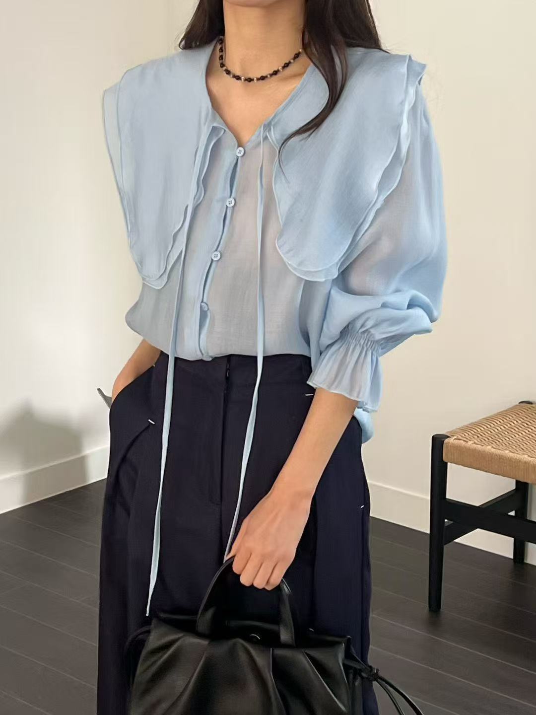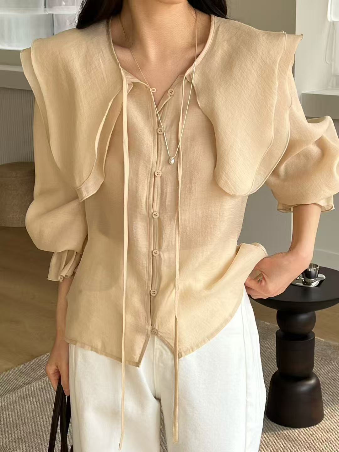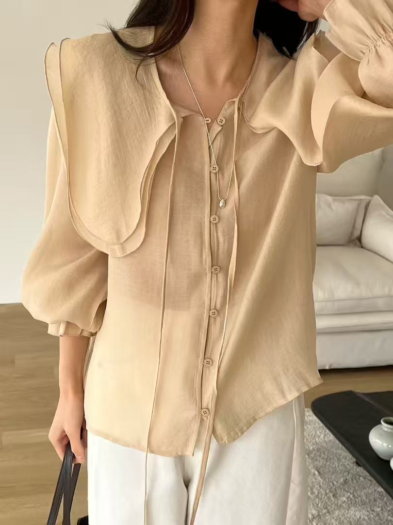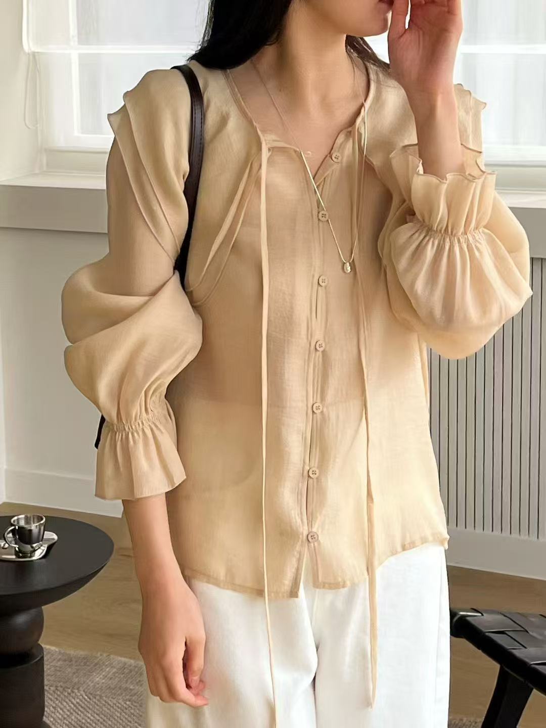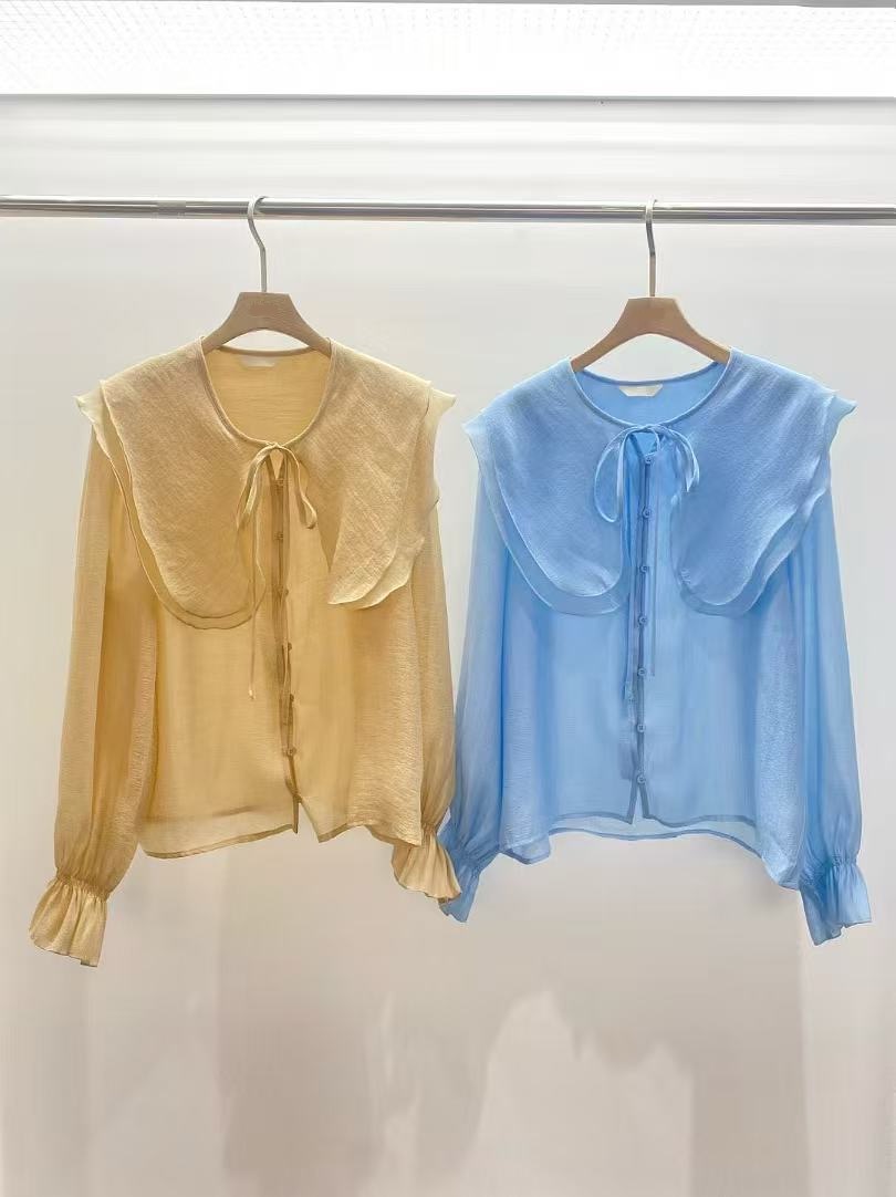 天絲大領片綁帶襯衫
