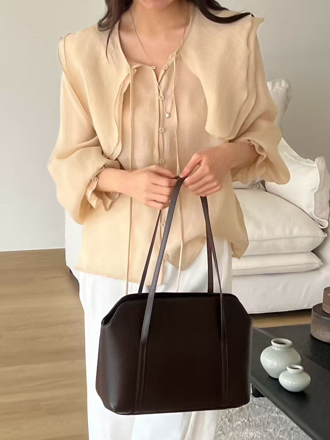 這款選用帶有柔軟光澤感的天絲材質,穿起來輕盈舒適,同時展現自然的垂墜感。搭配大領片與綁帶設計,讓整體多了一點溫柔與層次,不過於正式又有質感。