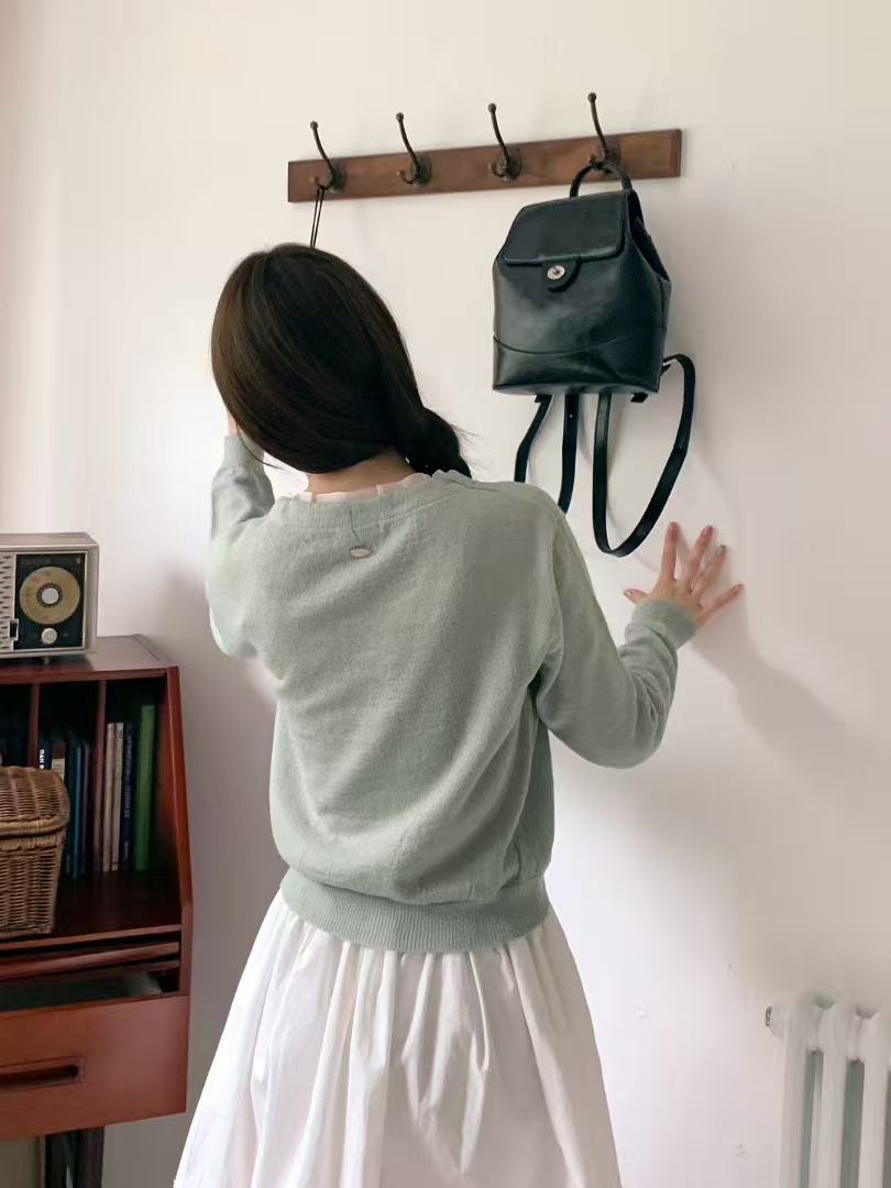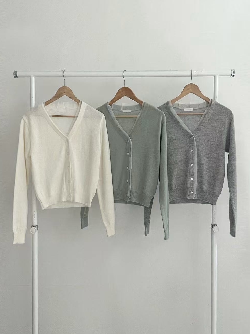 以細緻針織為主體,領口與門襟加入薄紗滾邊設計,在素面輪廓中形成低調的異材質層次。