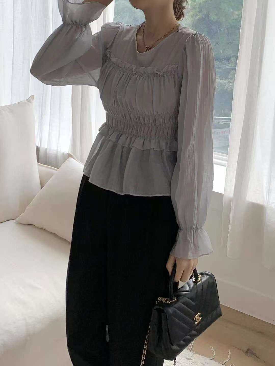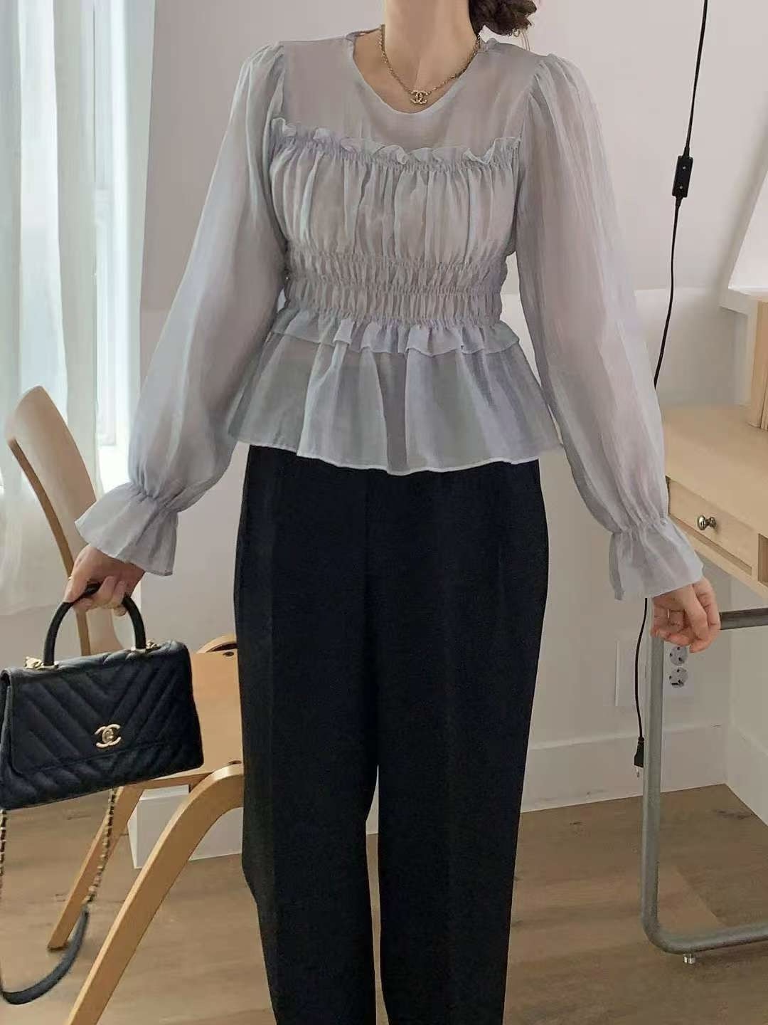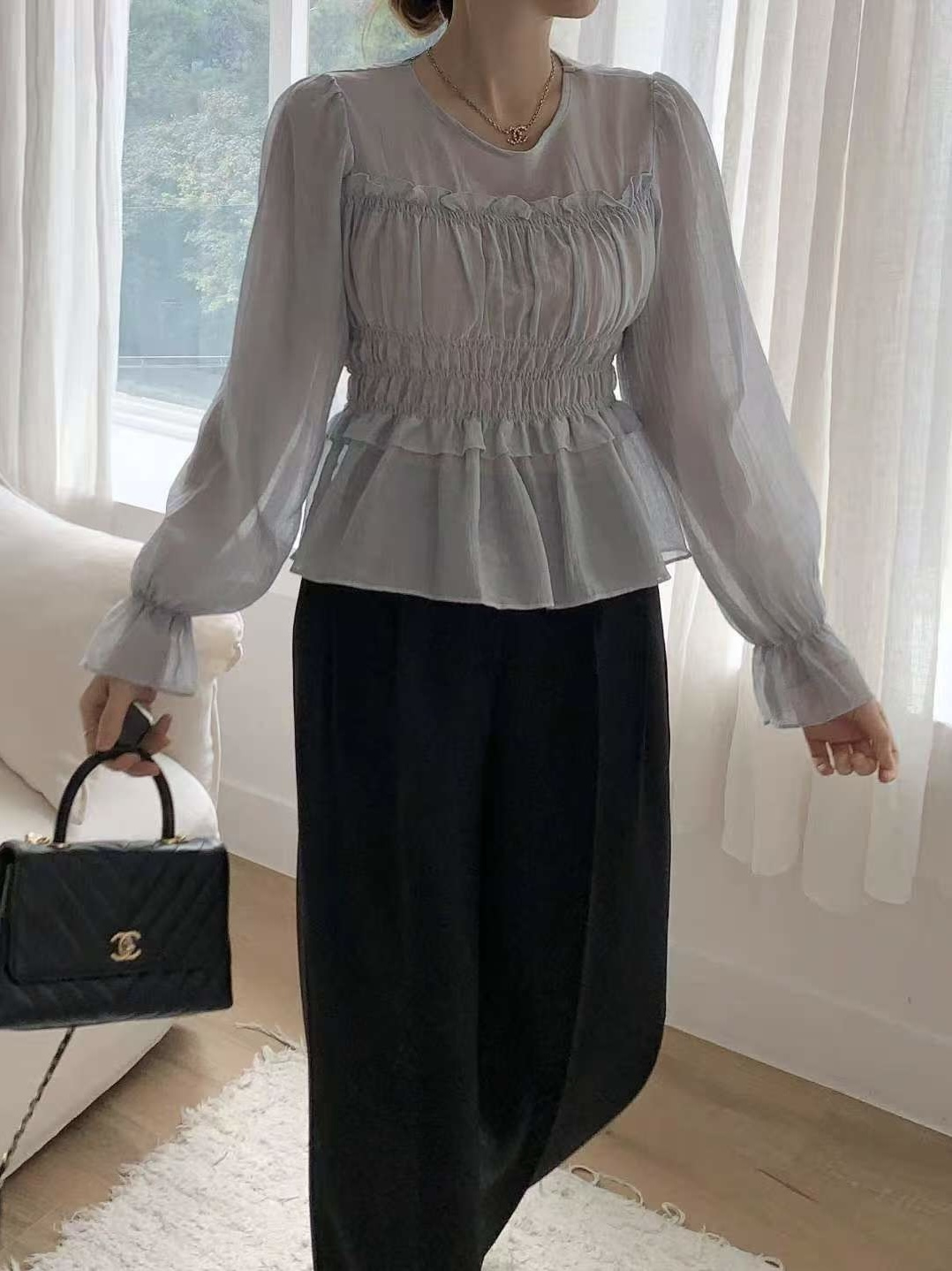 以輕薄微透的紗質布料製成,整體視覺柔霧細緻,在光線下呈現自然層次。
