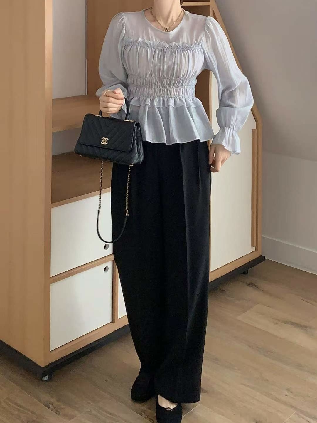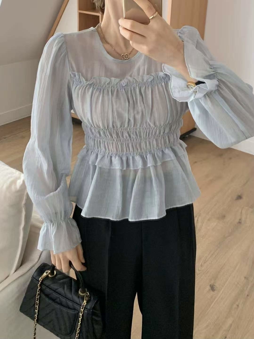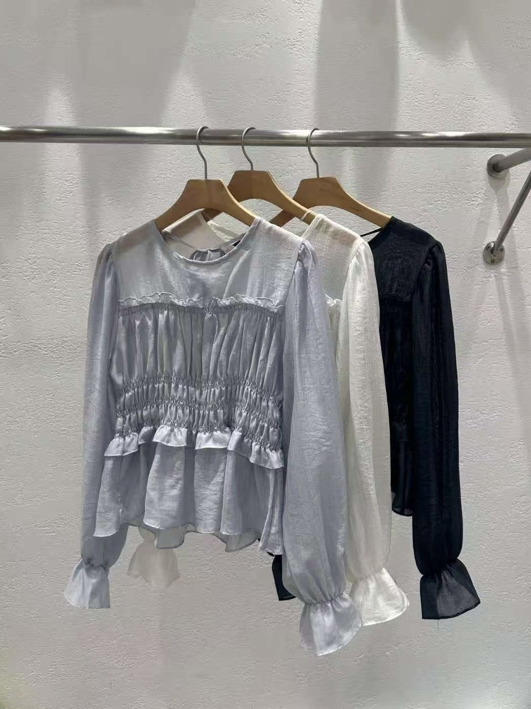 以輕薄微透的紗質布料製成,整體視覺柔霧細緻,在光線下呈現自然層次。