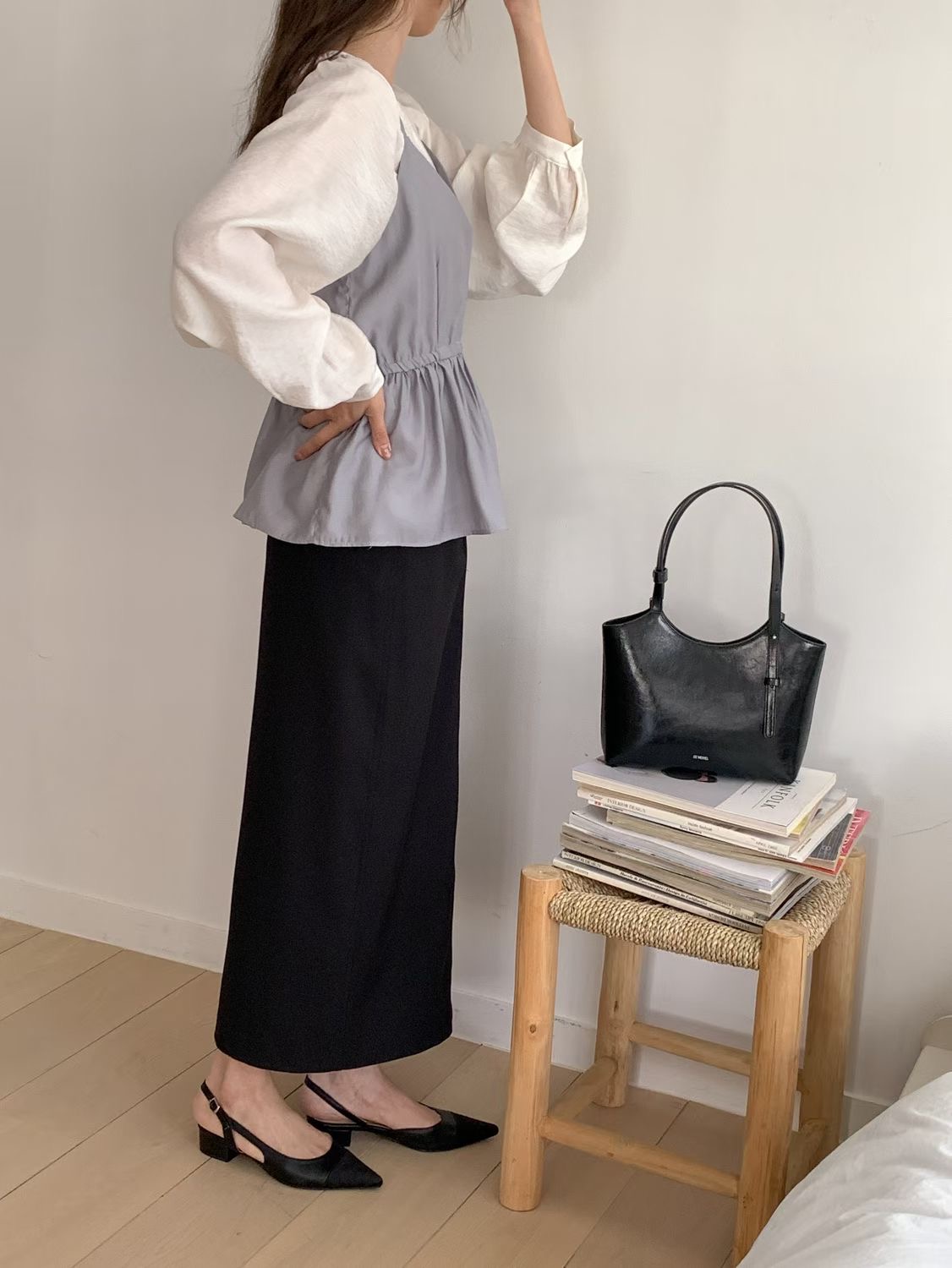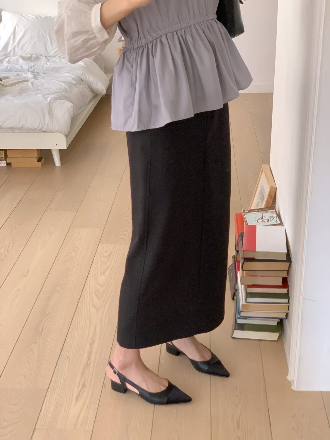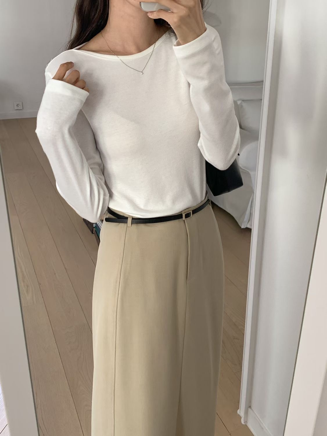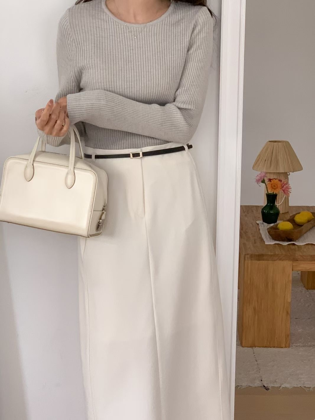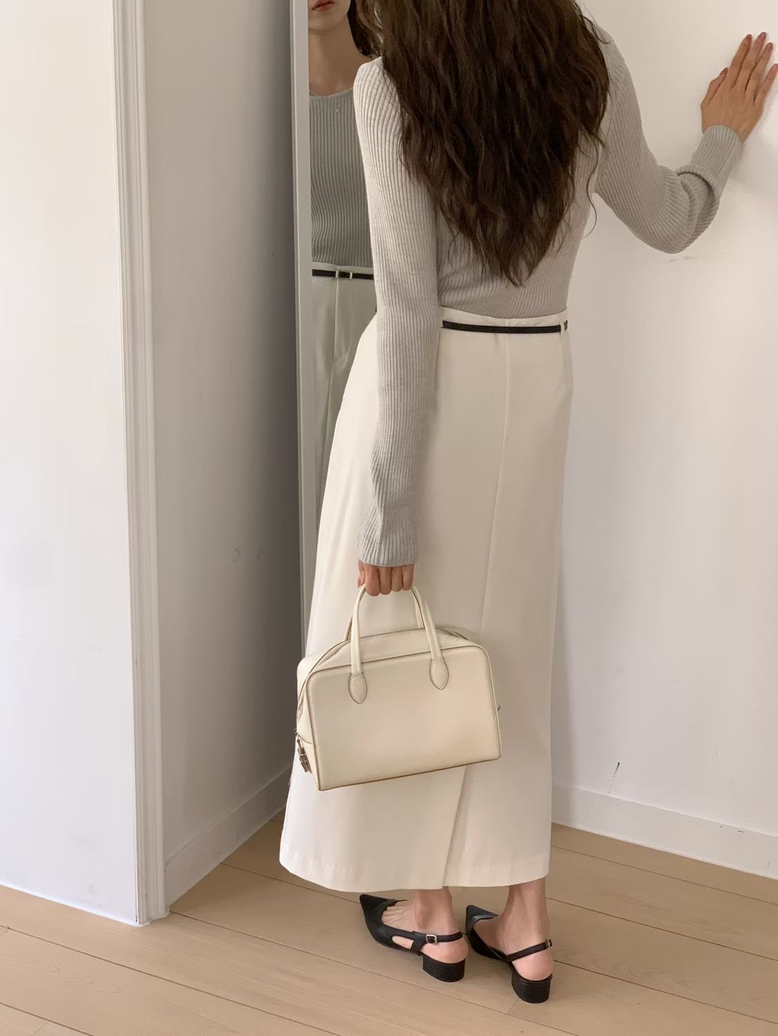 筆直的中線設計,讓腿型看起來更修長;中長裙長度剛好落在小腿位置,比例自然、優雅不厚重。附細皮帶的小細節,讓整體更俐落,也能輕鬆拉高腰線。