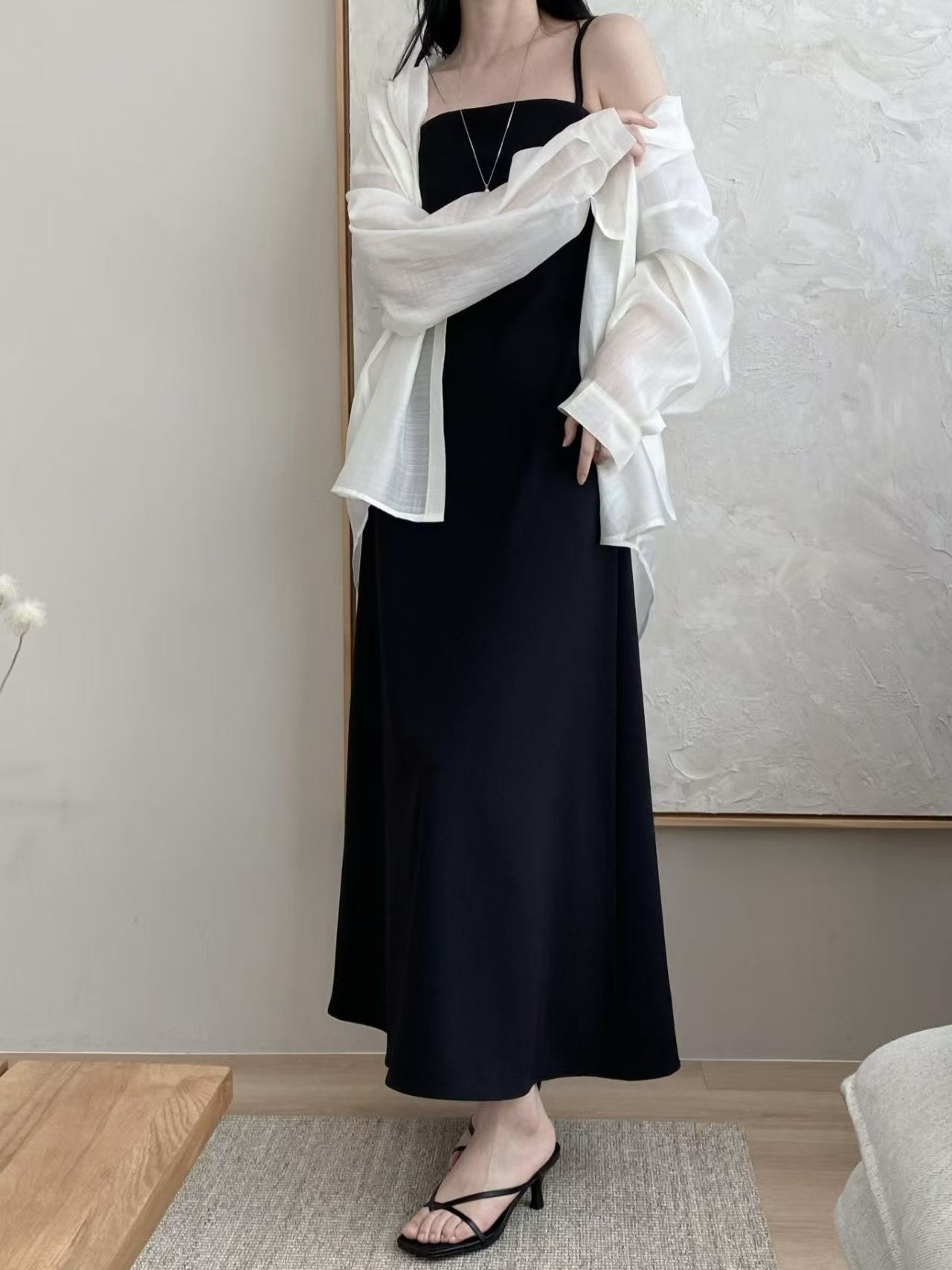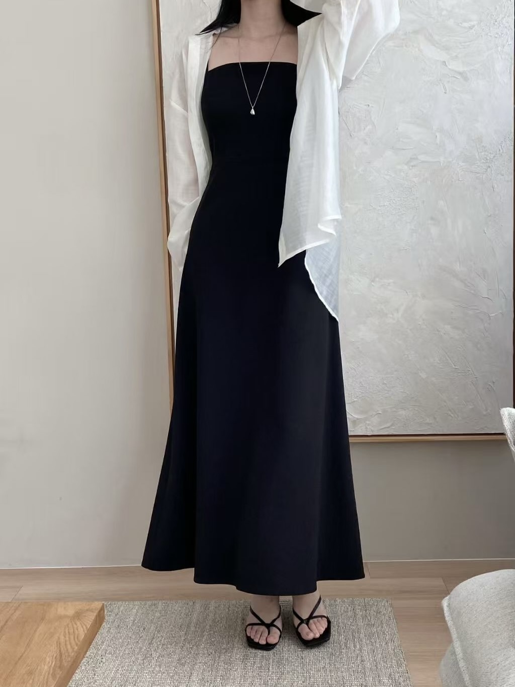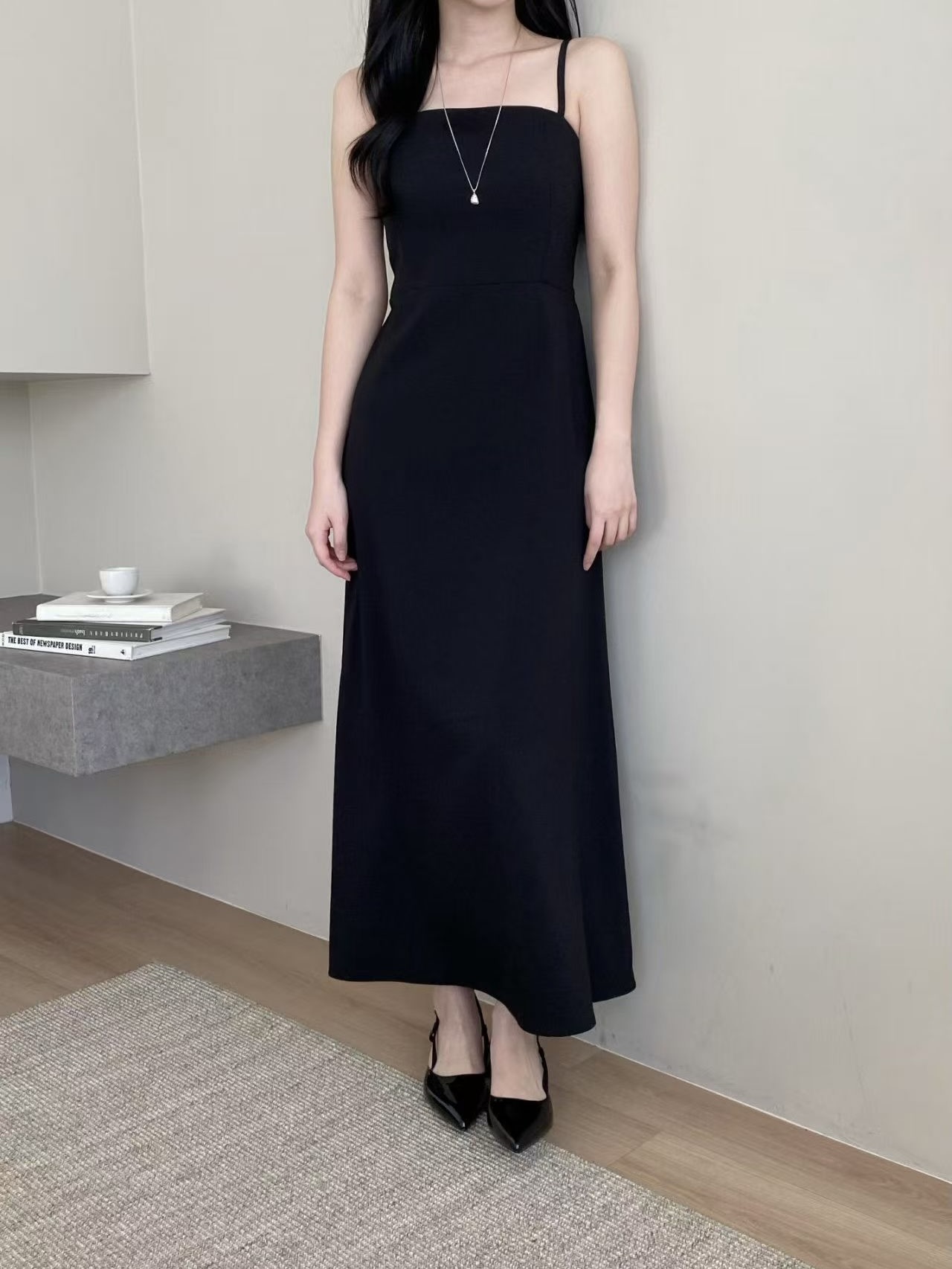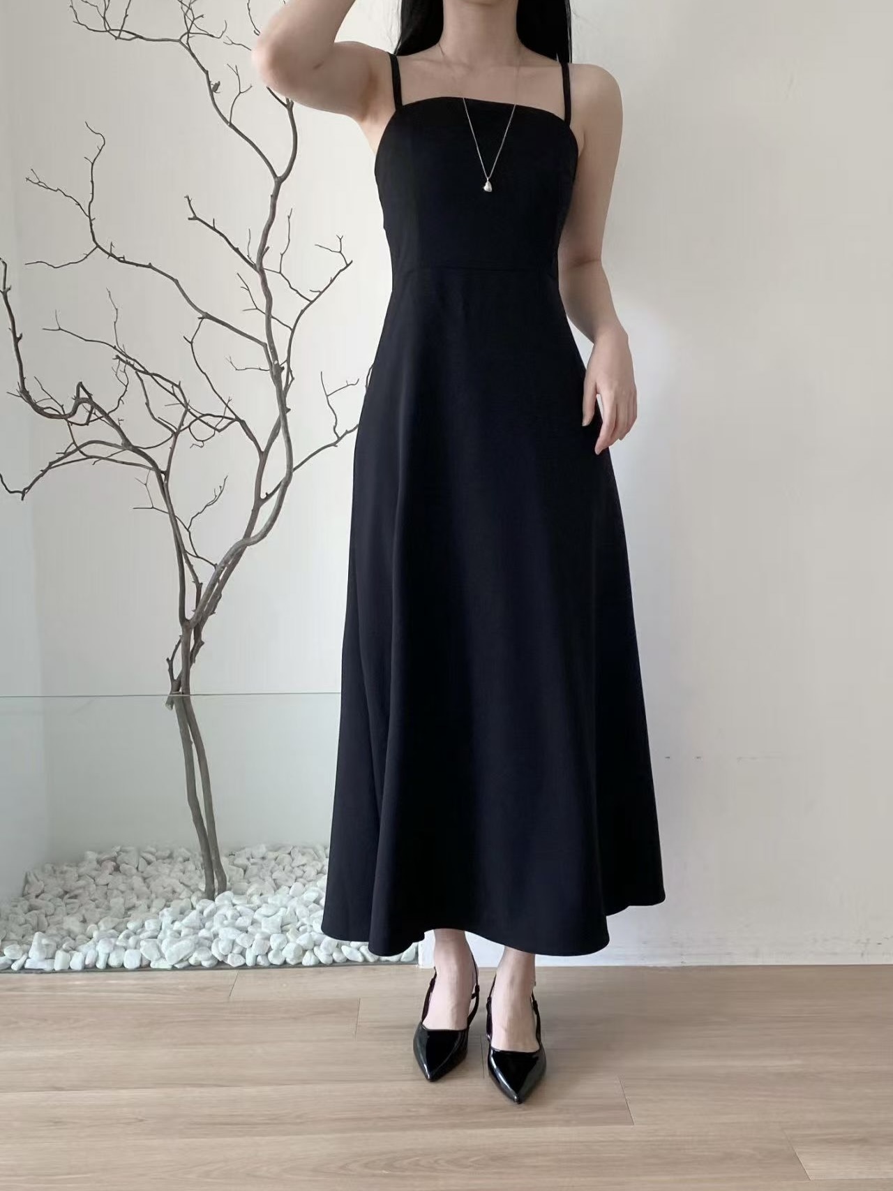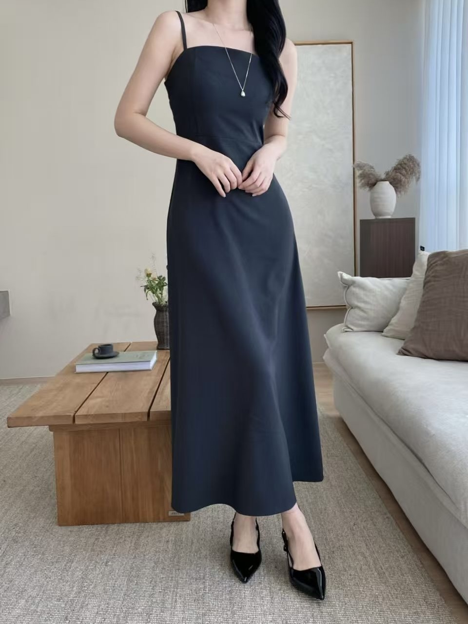 簡潔俐落的細肩帶設計搭配自然垂墜的A字裙擺,整體呈現出很乾淨的韓系氣質感。