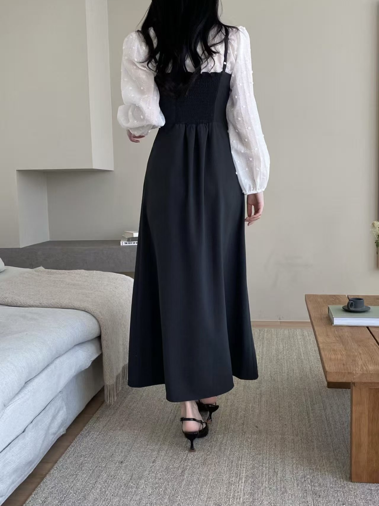版型線條簡單但比例很好,穿起來能自然拉高腰線,讓整體身形看起來更加修長,是一件日常與約會都很適合的長洋裝。