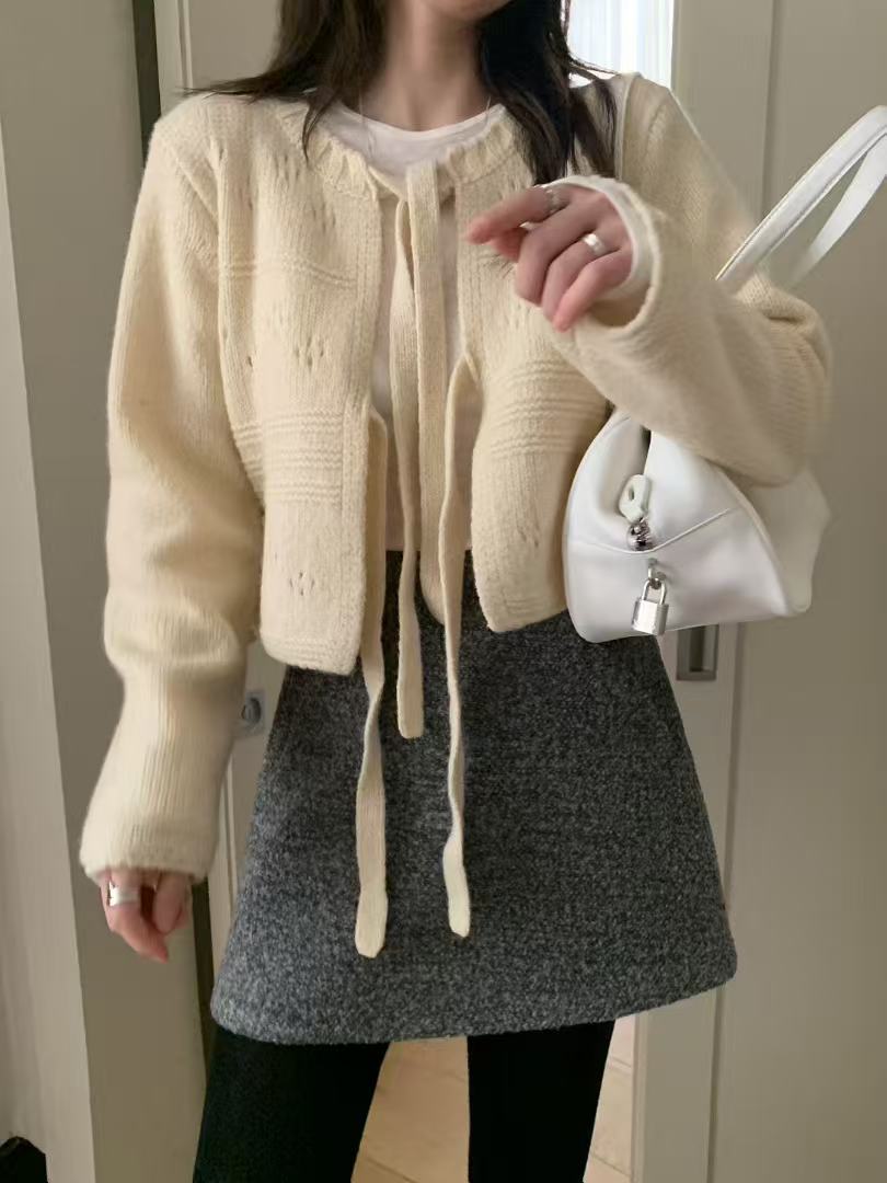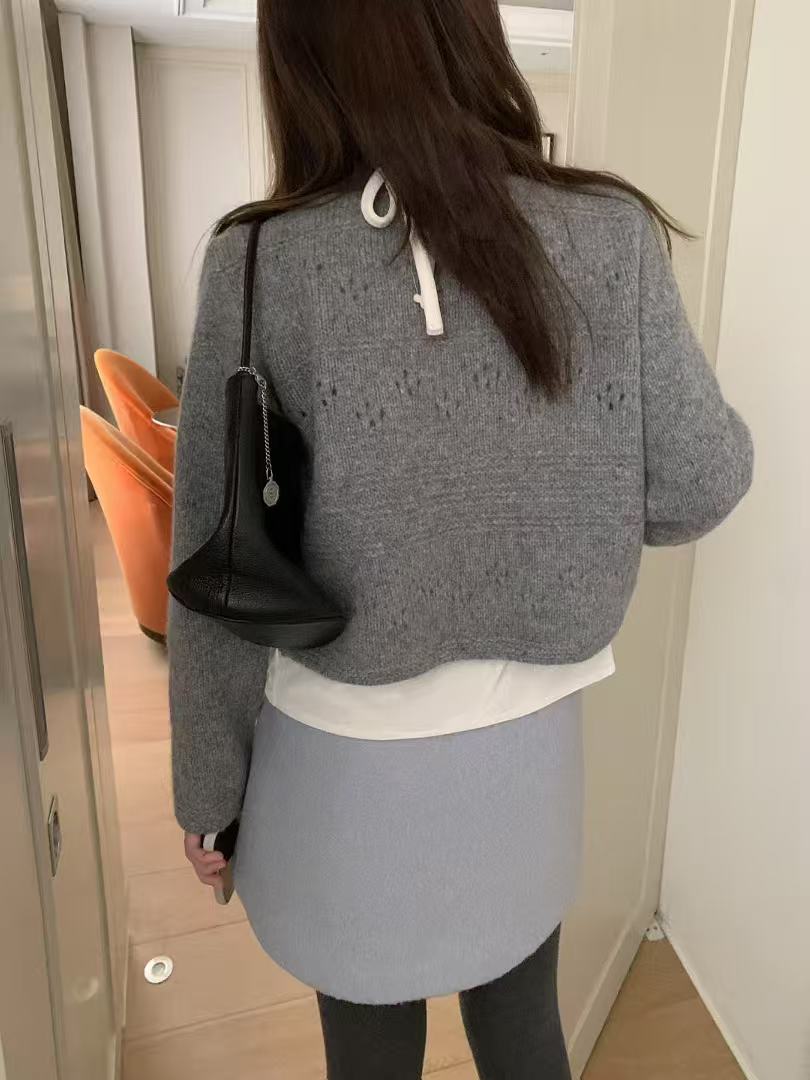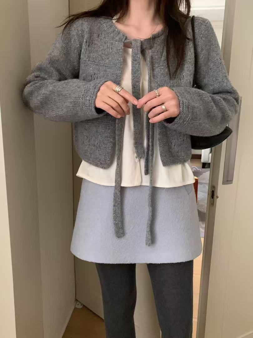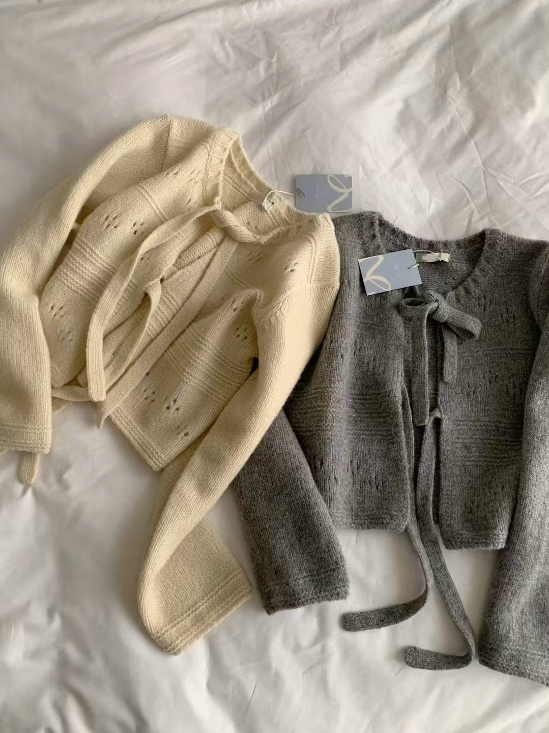 柔軟親膚的針織材質,搭配細緻綁帶設計,可依當天心情選擇開襟在前或綁帶在後,正反皆可穿。