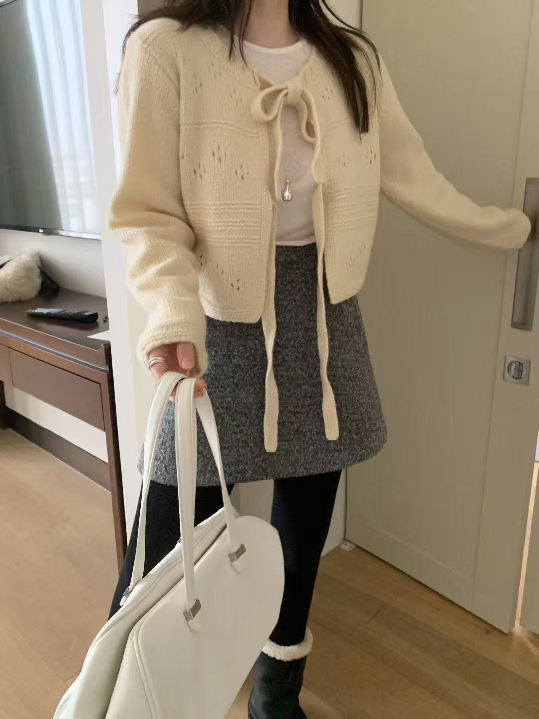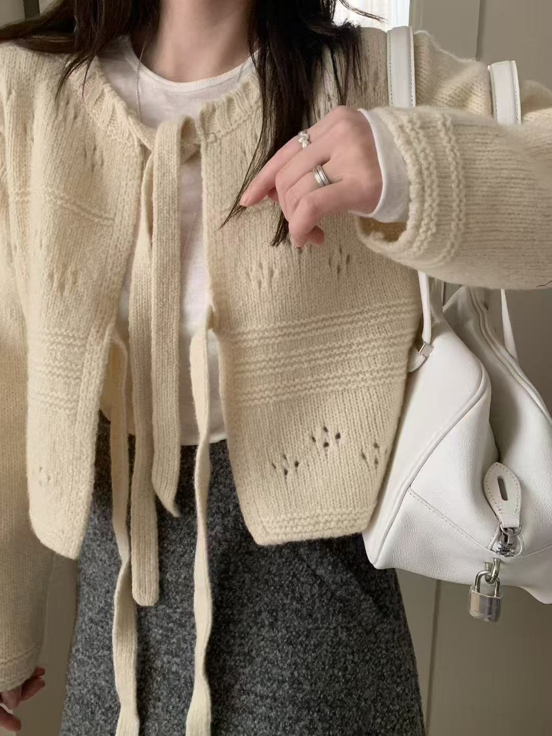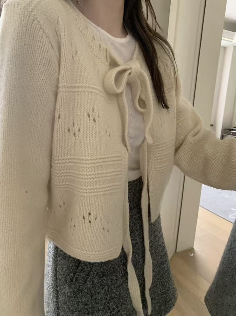 柔軟親膚的針織材質,搭配細緻綁帶設計,可依當天心情選擇開襟在前或綁帶在後,正反皆可穿。