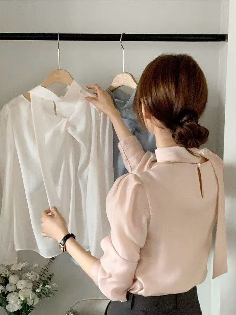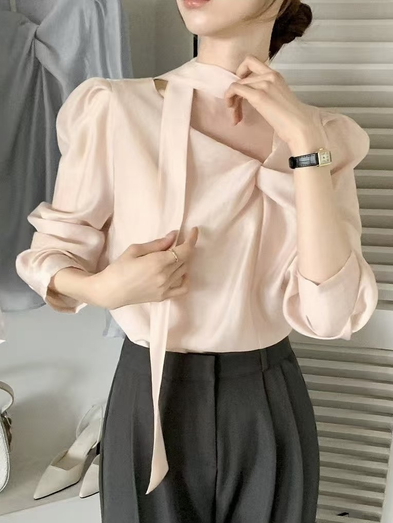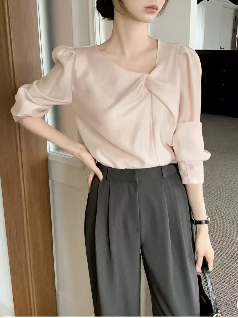 面料輕柔滑順,穿起來帶有微微光澤感,能自然提升整體質感。肩線帶有微澎袖設計,修飾肩型,同時讓上半身比例更立體。