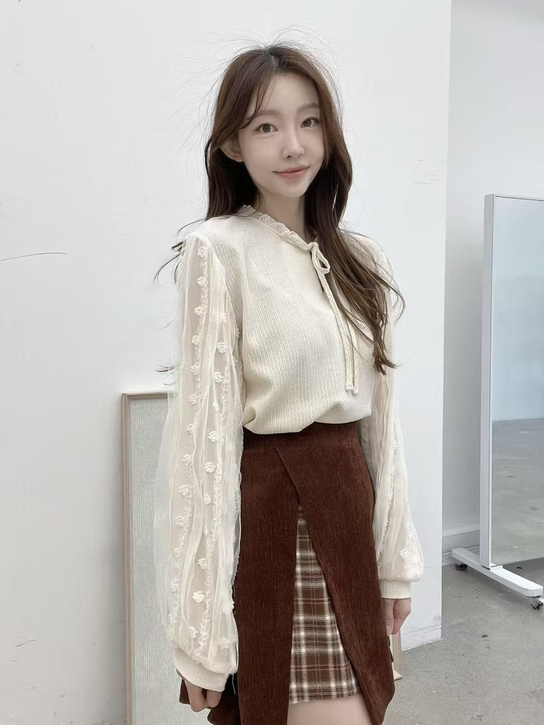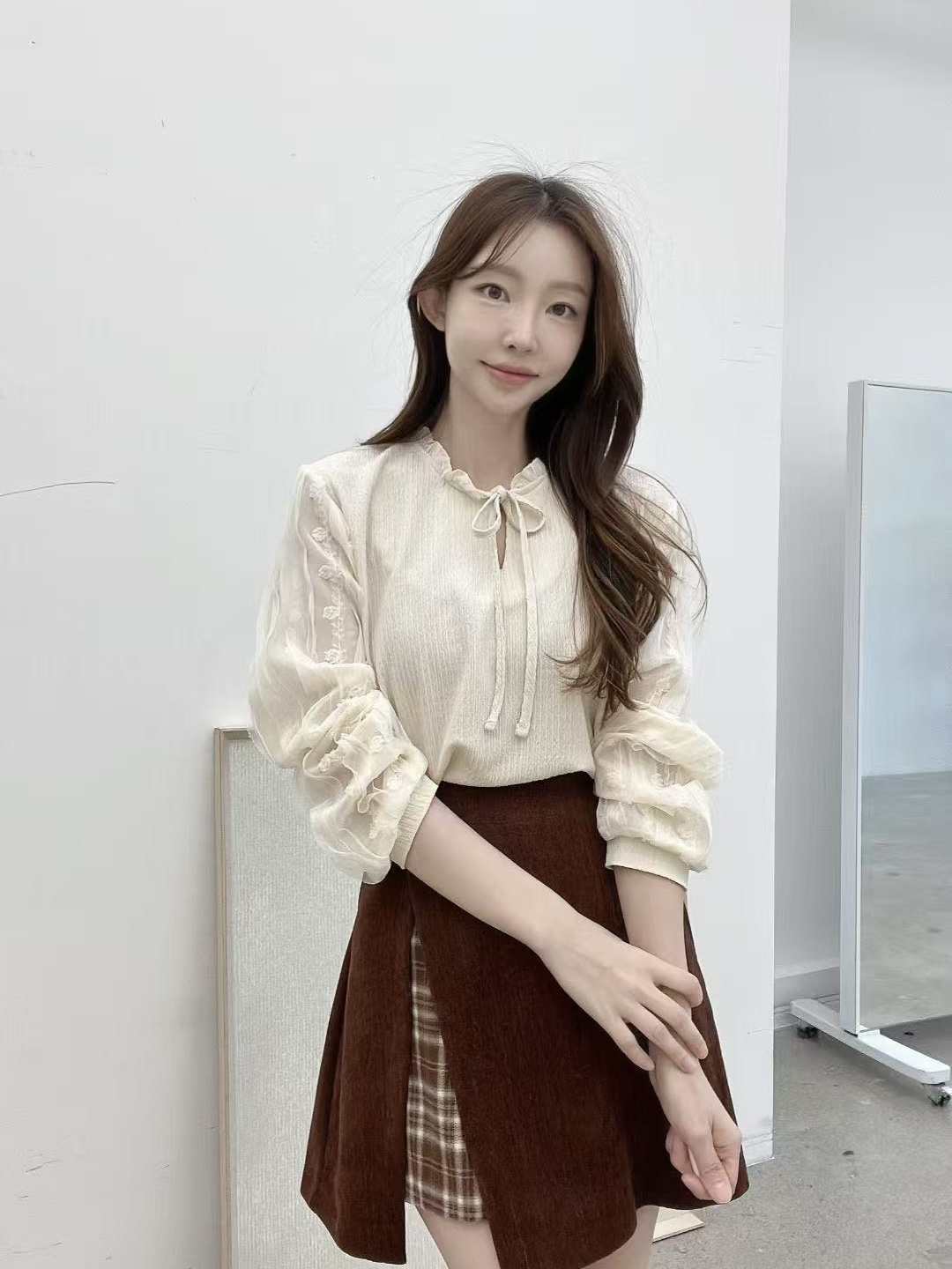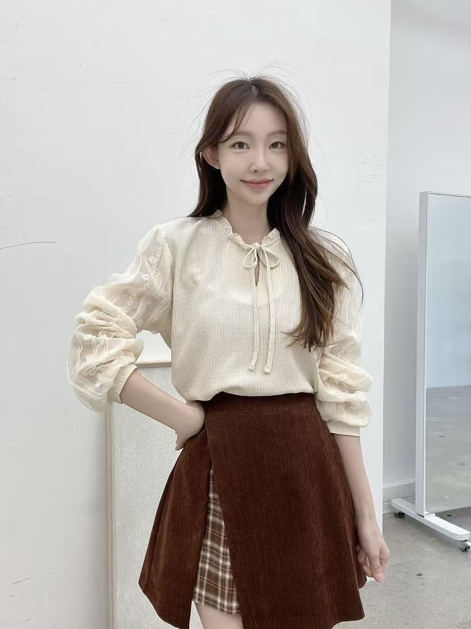 胸前蝴蝶結綁帶細節讓整體多了一點可愛氛圍,日常穿搭也不會過於甜膩。