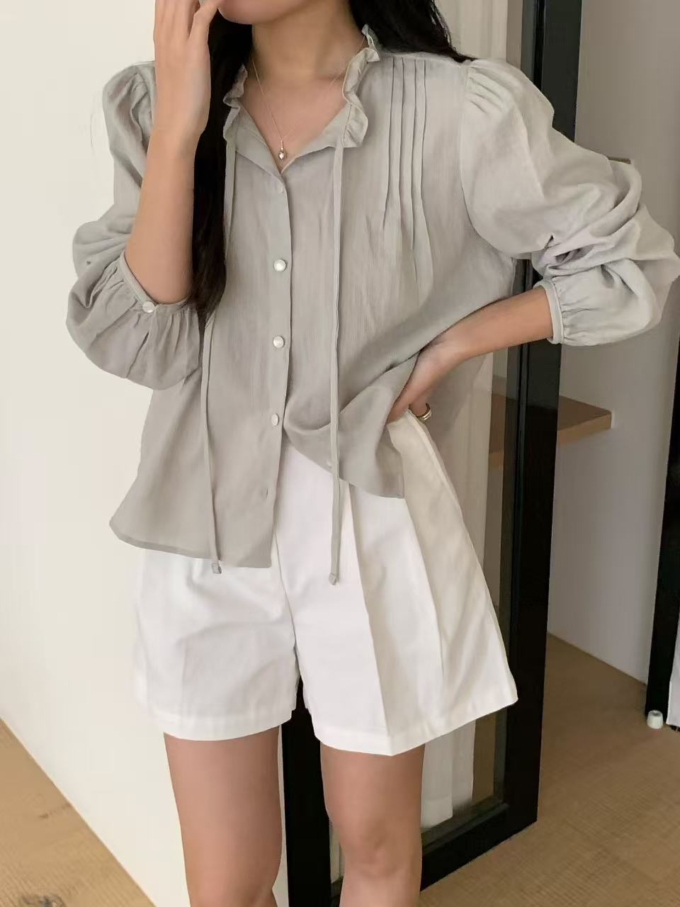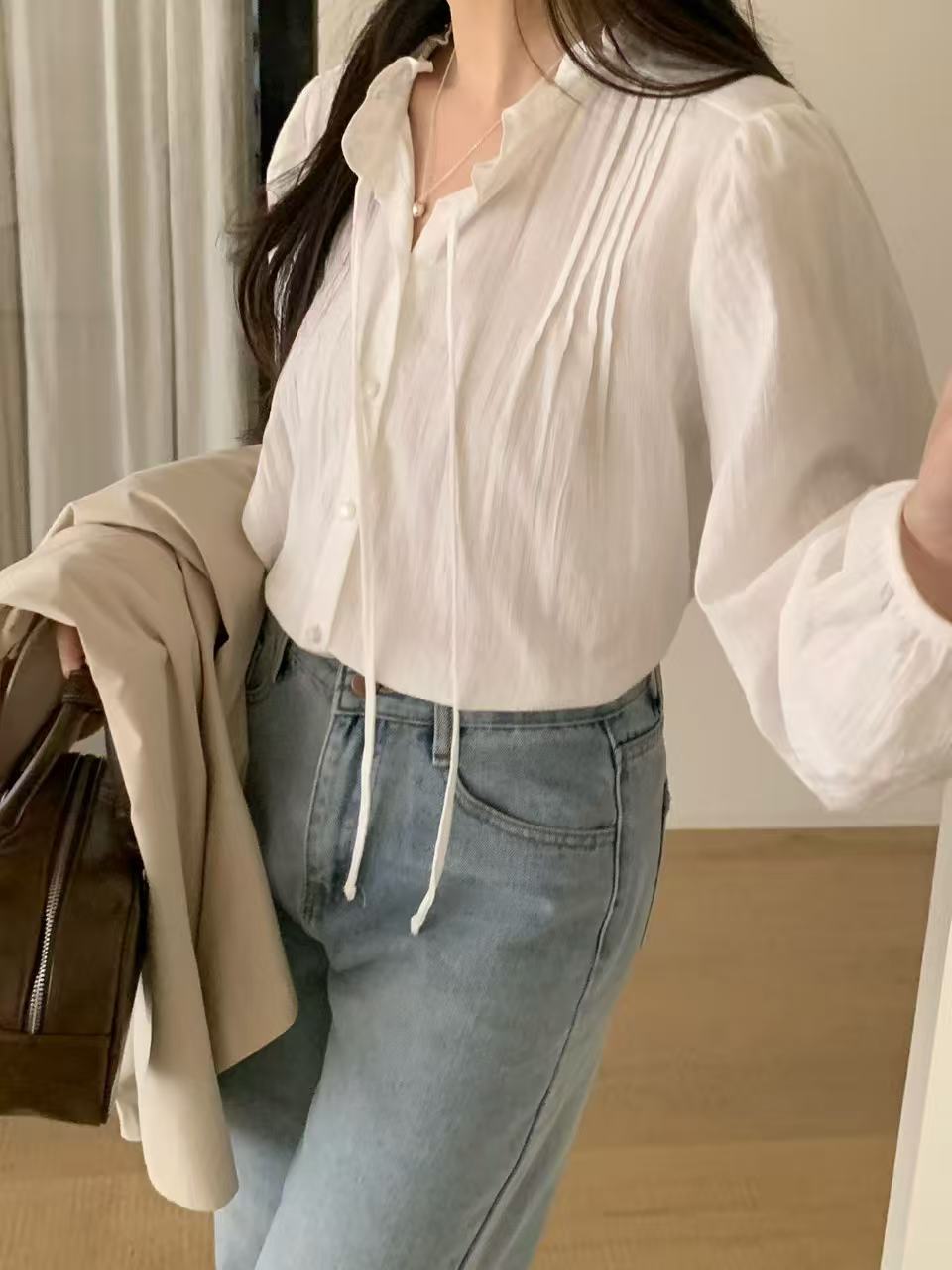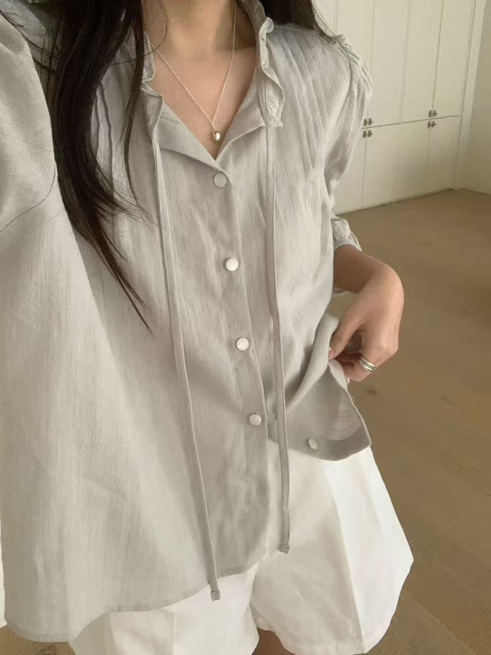 這款襯衫在細節上做得很精緻,從領口的微抓皺設計,到前排的貓眼釦,都讓整體多了一點溫柔感。布料輕薄帶點微透感,穿起來柔軟不厚重,很適合日常或通勤搭配。版型偏寬鬆,不會貼身,搭配牛仔褲、長裙或西裝褲都很合適,是一件帶有設計感、但又不會過於正式的上衣。