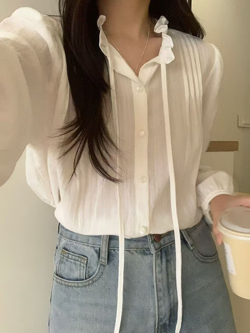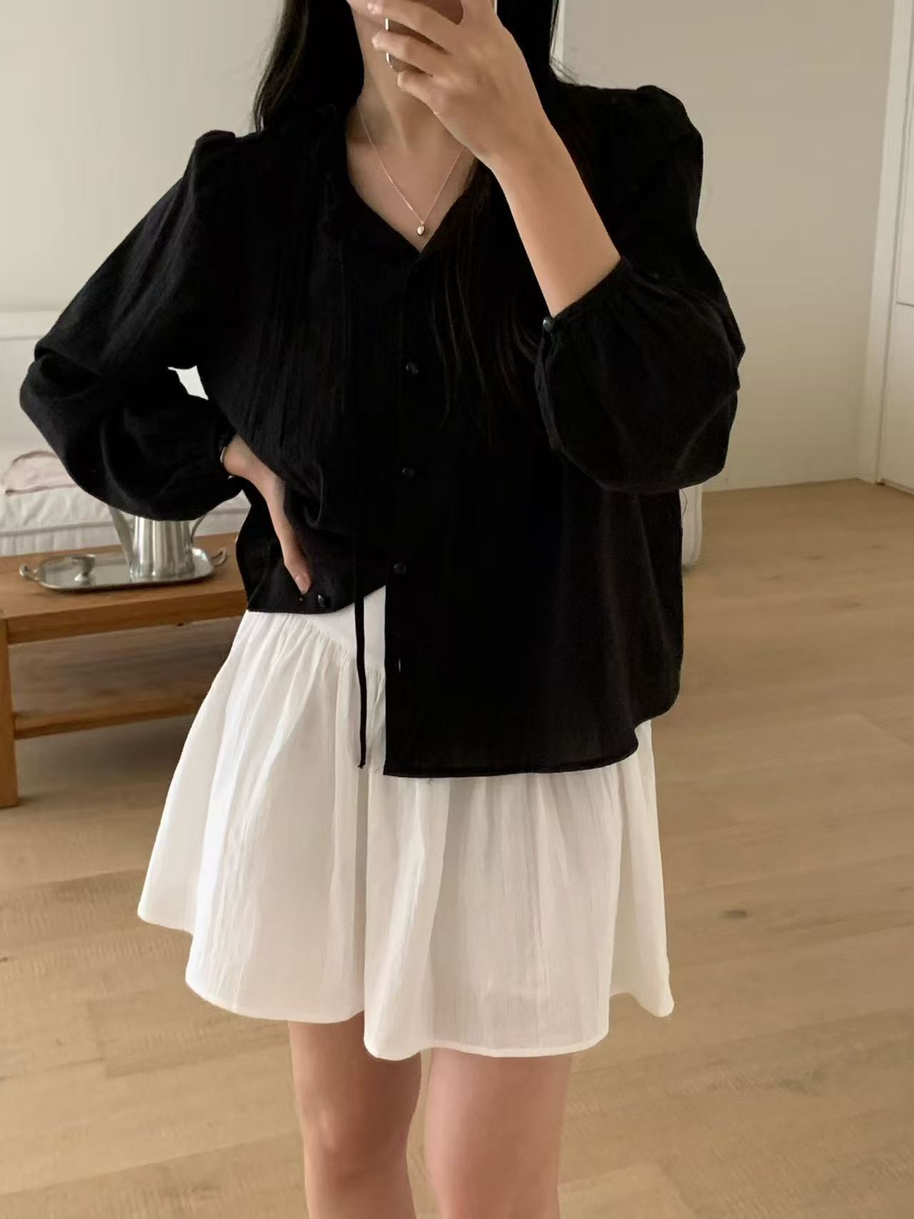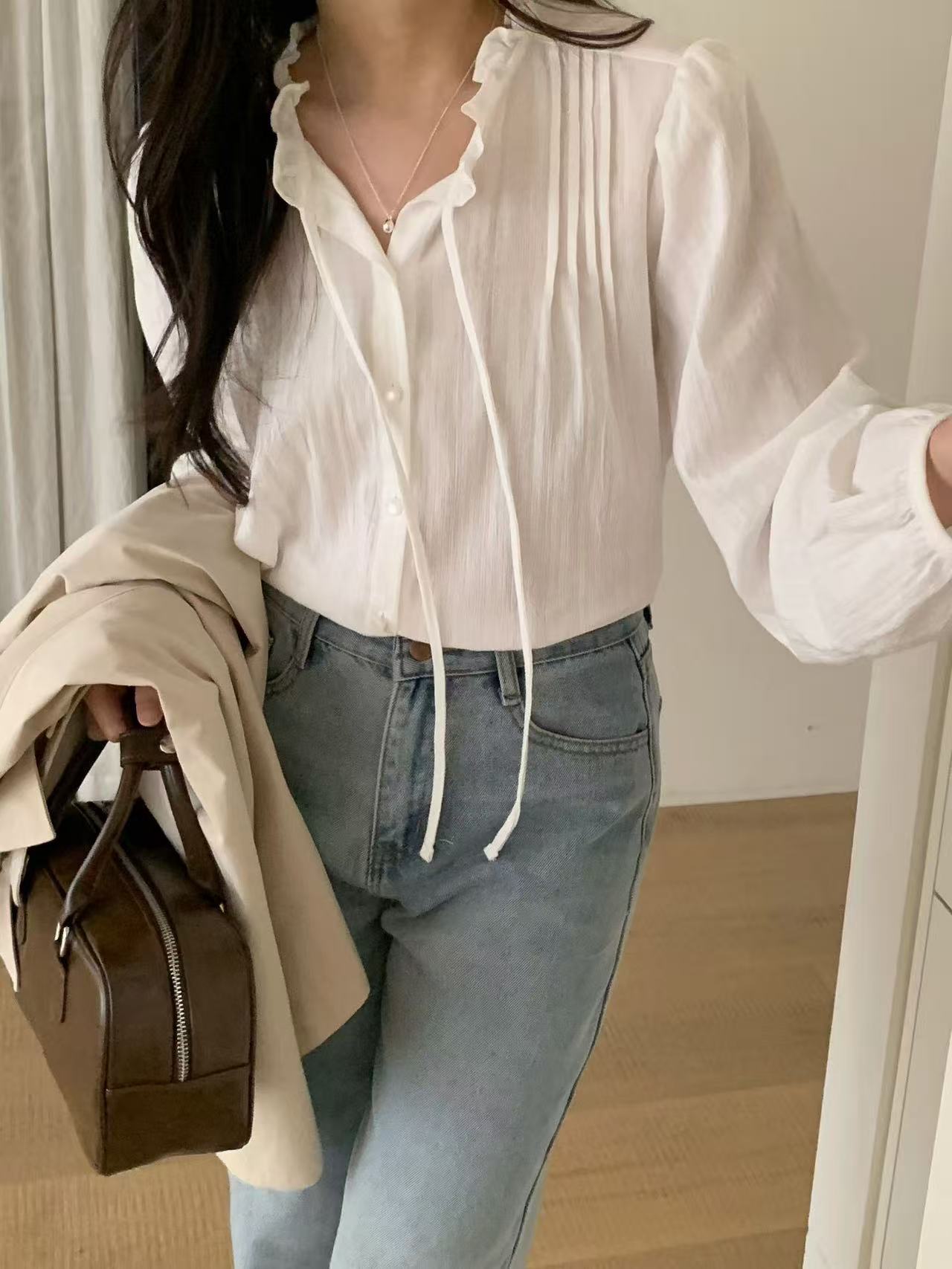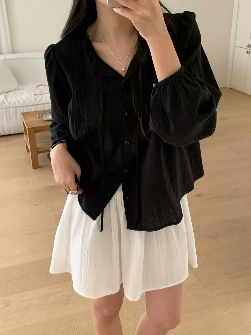 這款襯衫在細節上做得很精緻,從領口的微抓皺設計,到前排的貓眼釦,都讓整體多了一點溫柔感。布料輕薄帶點微透感,穿起來柔軟不厚重,很適合日常或通勤搭配。版型偏寬鬆,不會貼身,搭配牛仔褲、長裙或西裝褲都很合適,是一件帶有設計感、但又不會過於正式的上衣。