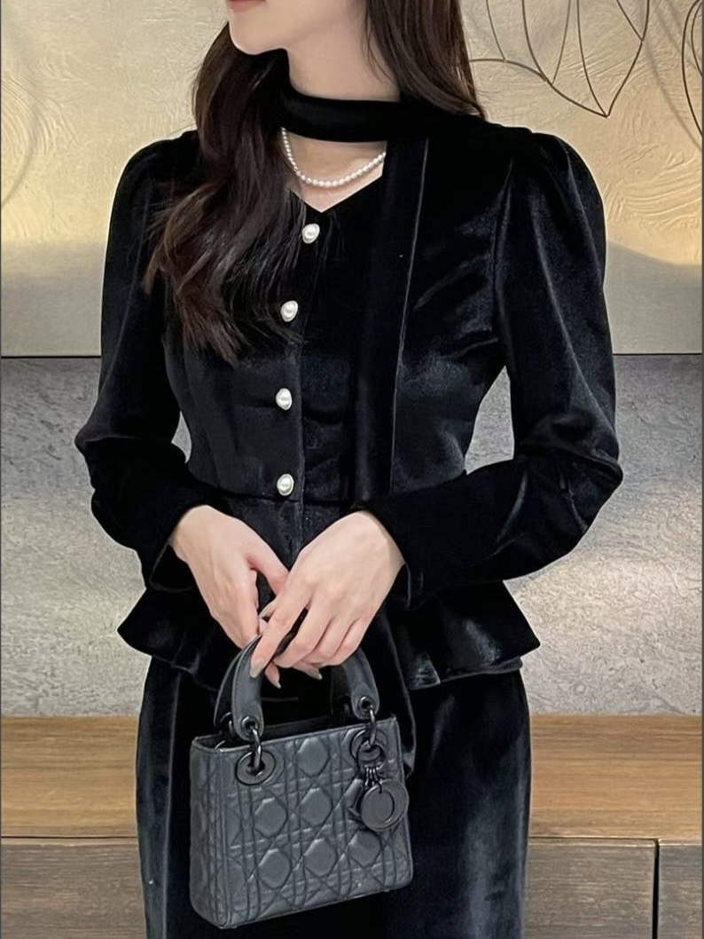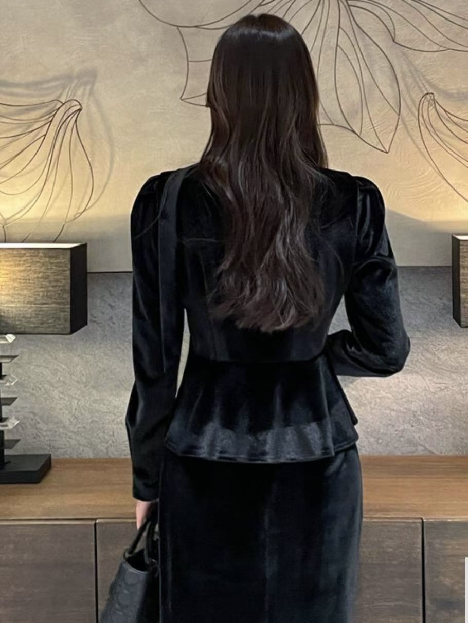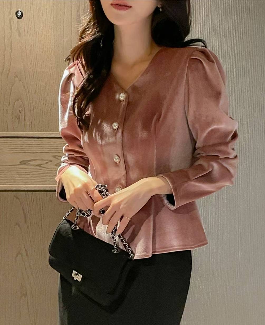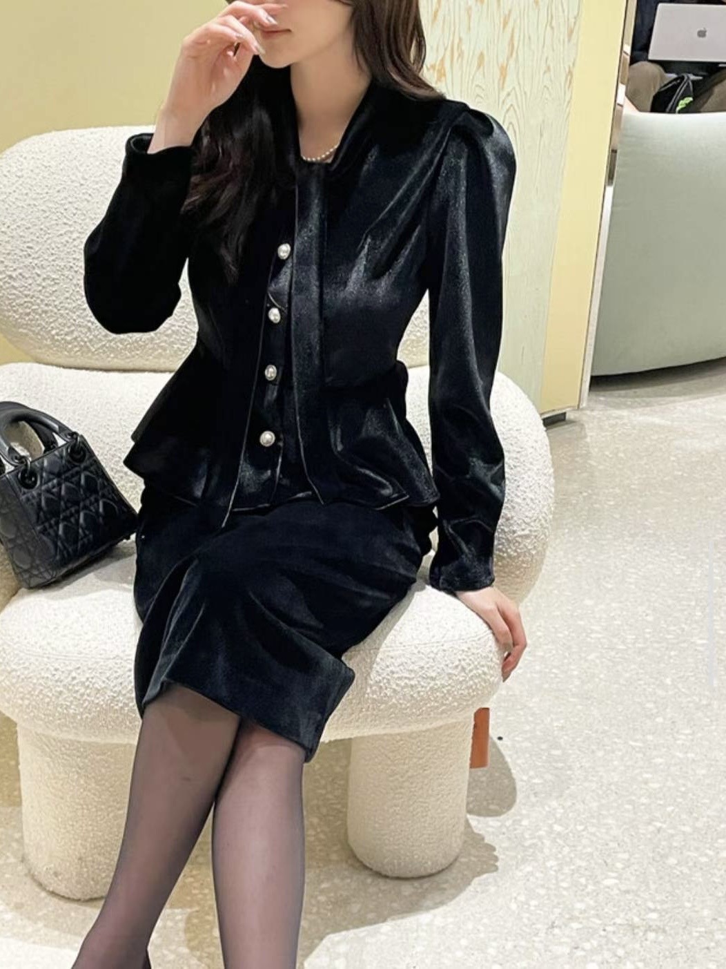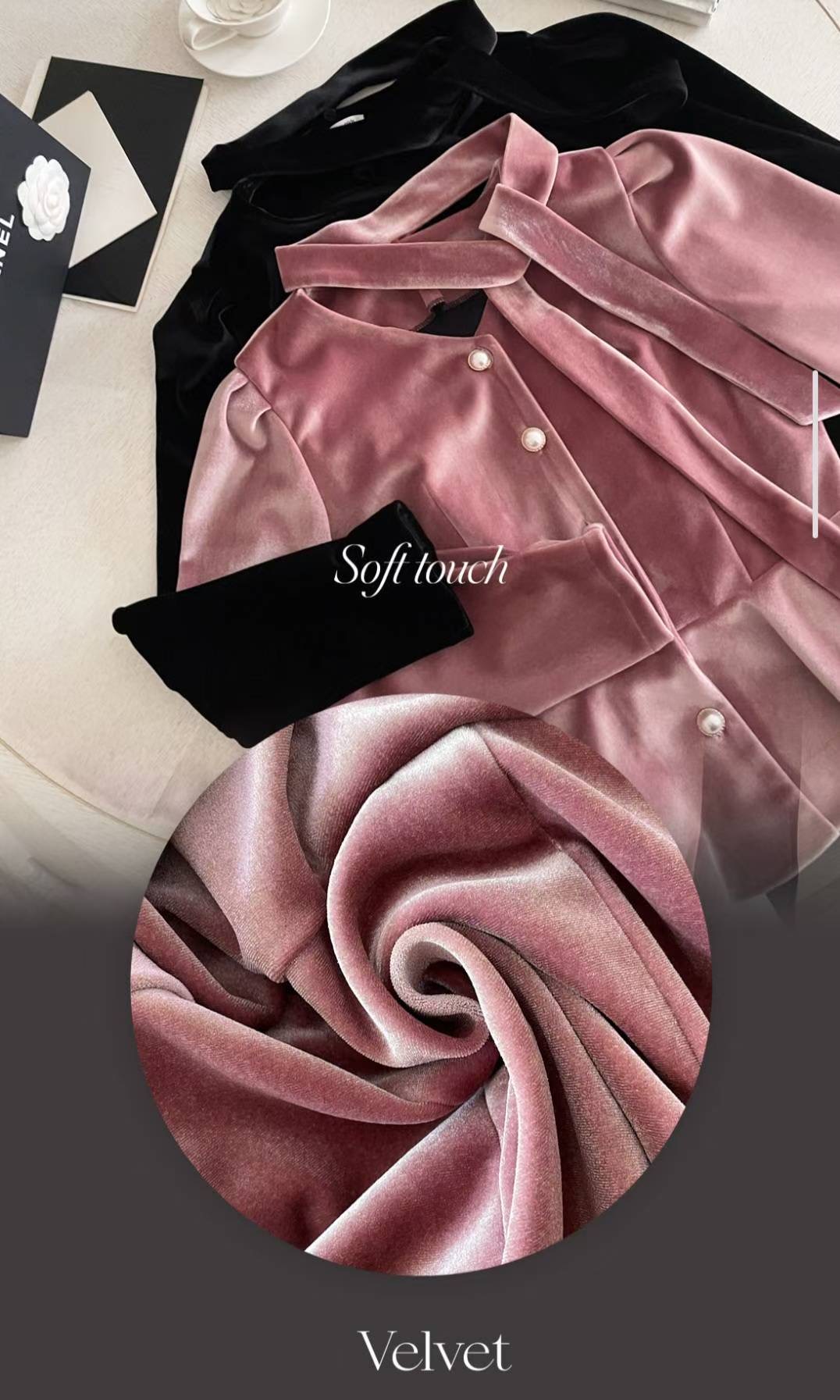 以柔霧光澤的絲絨面料打造,呈現高級低調的冬季質感。