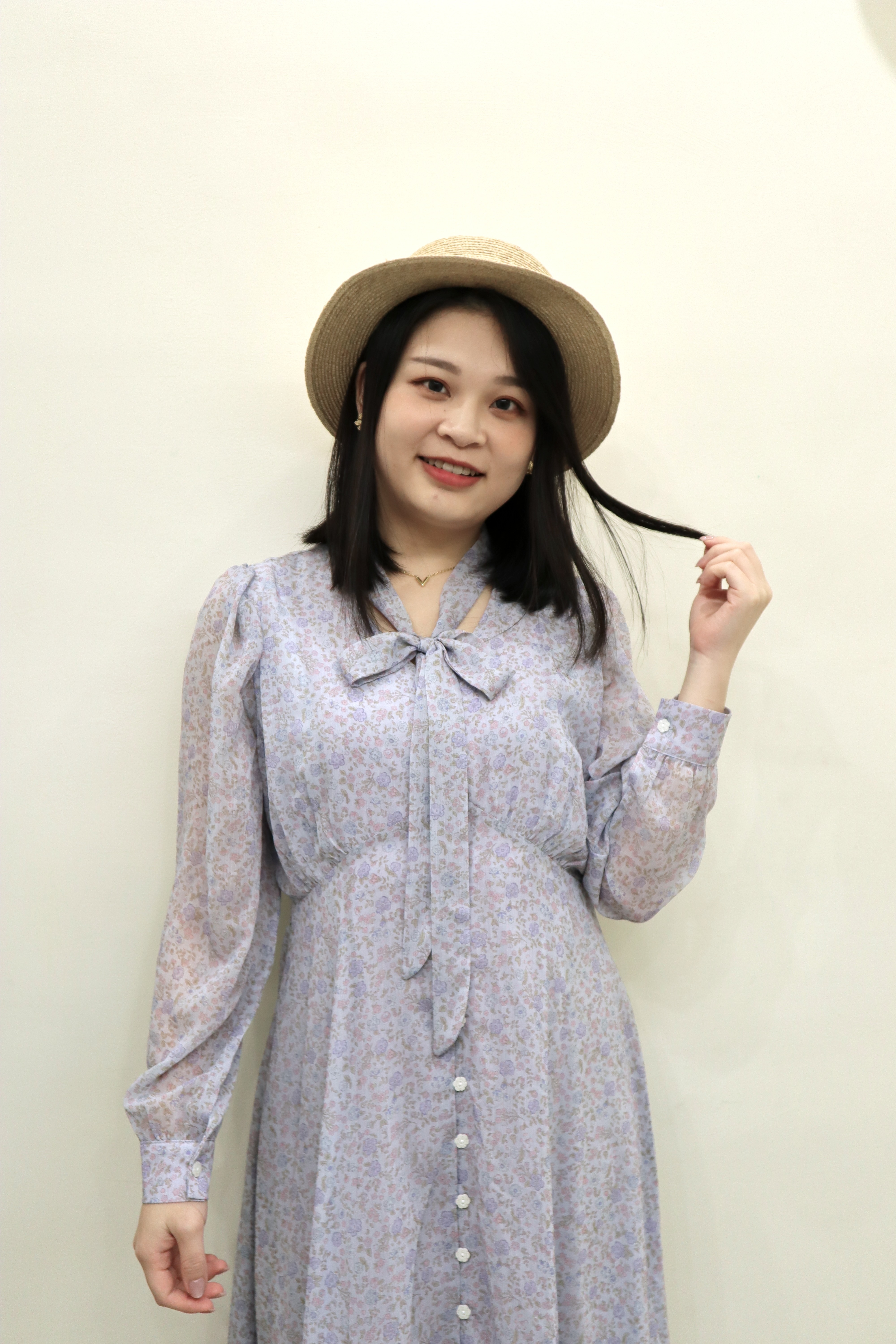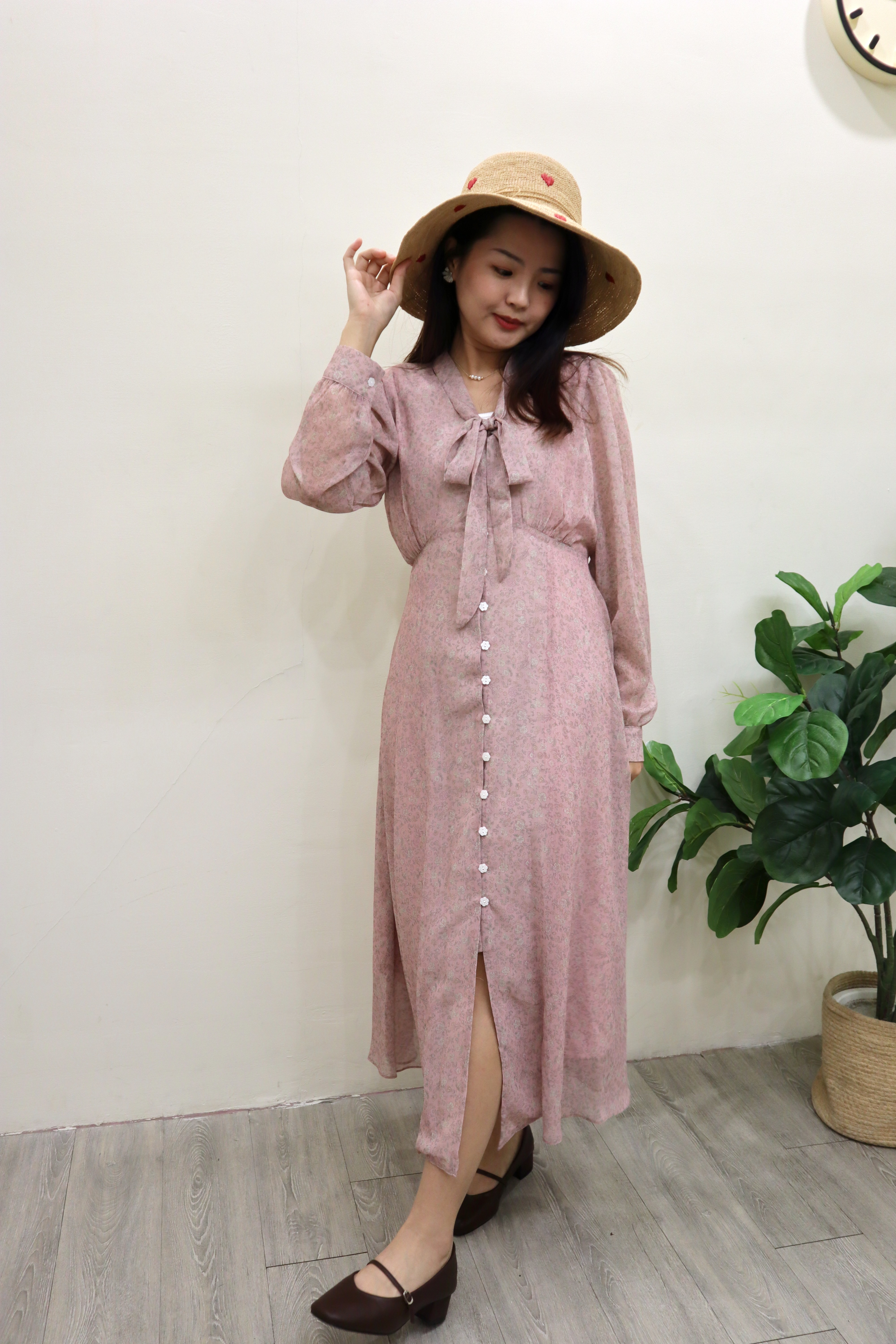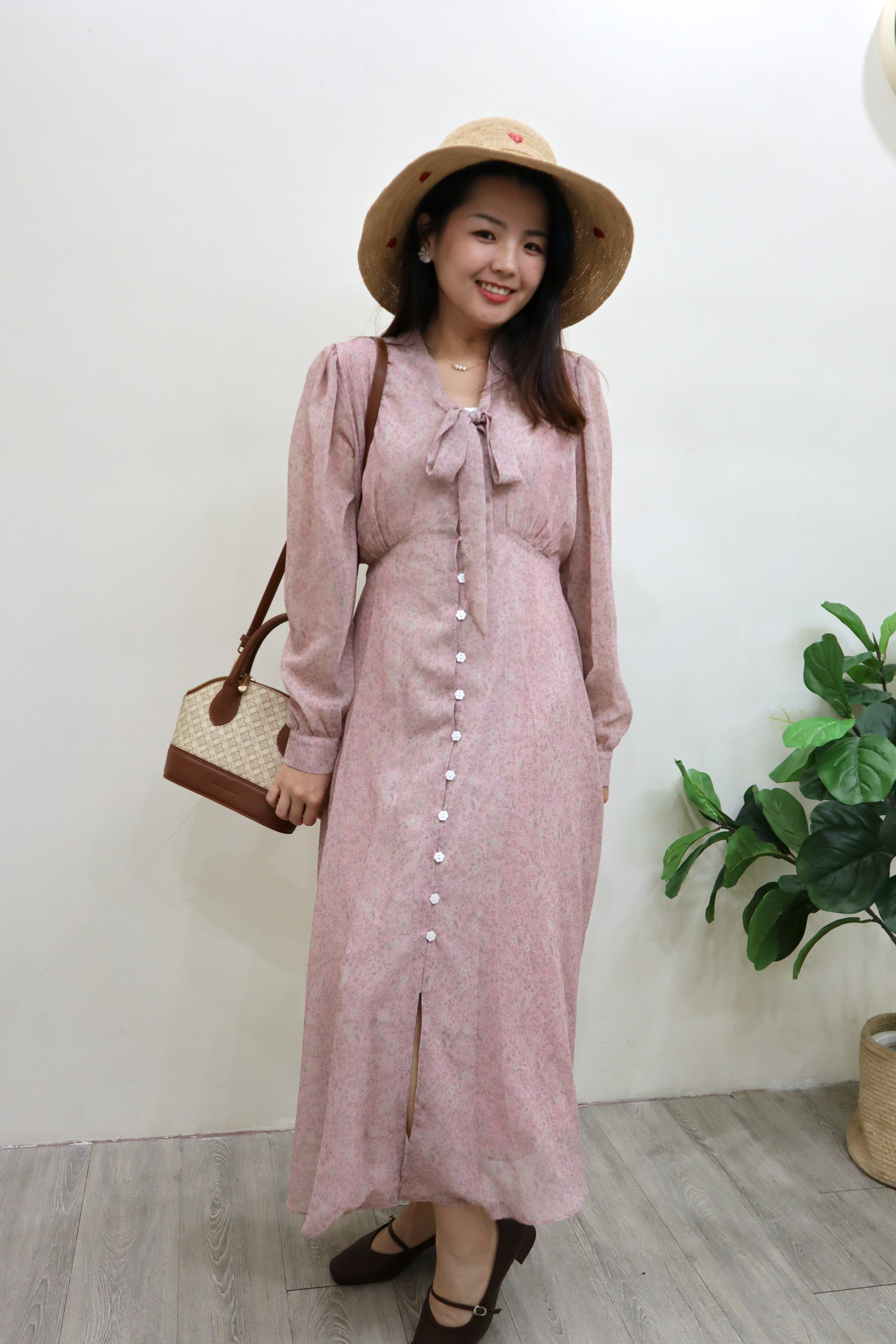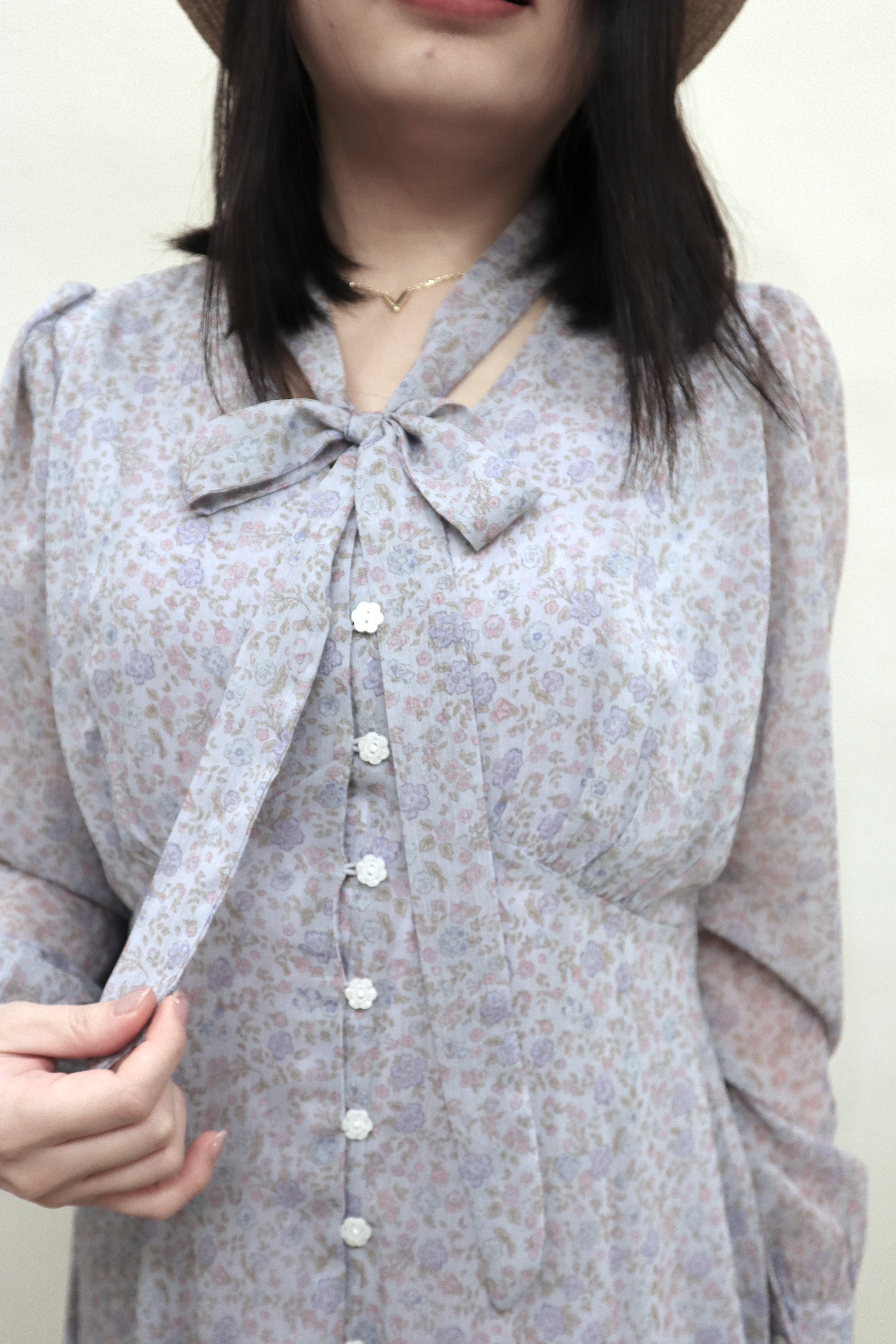 前排花形扣與領口綁帶設計,在優雅之中增添一抹甜美氣息。