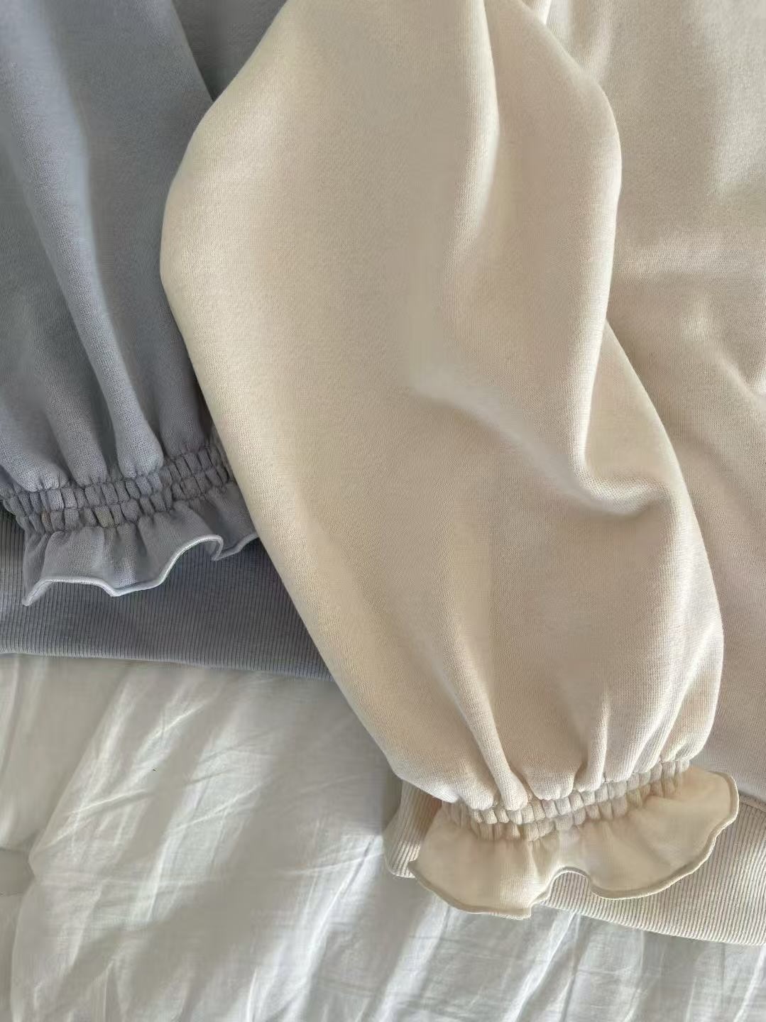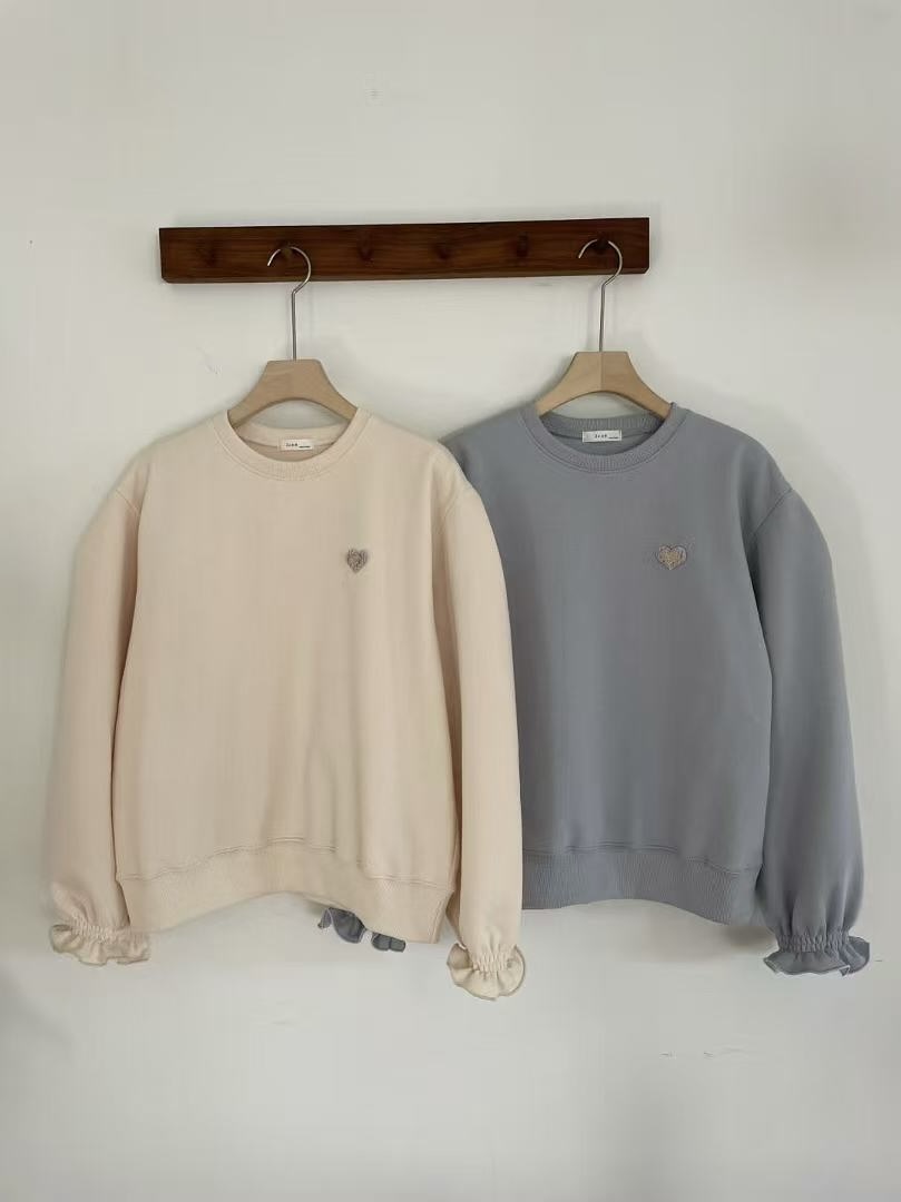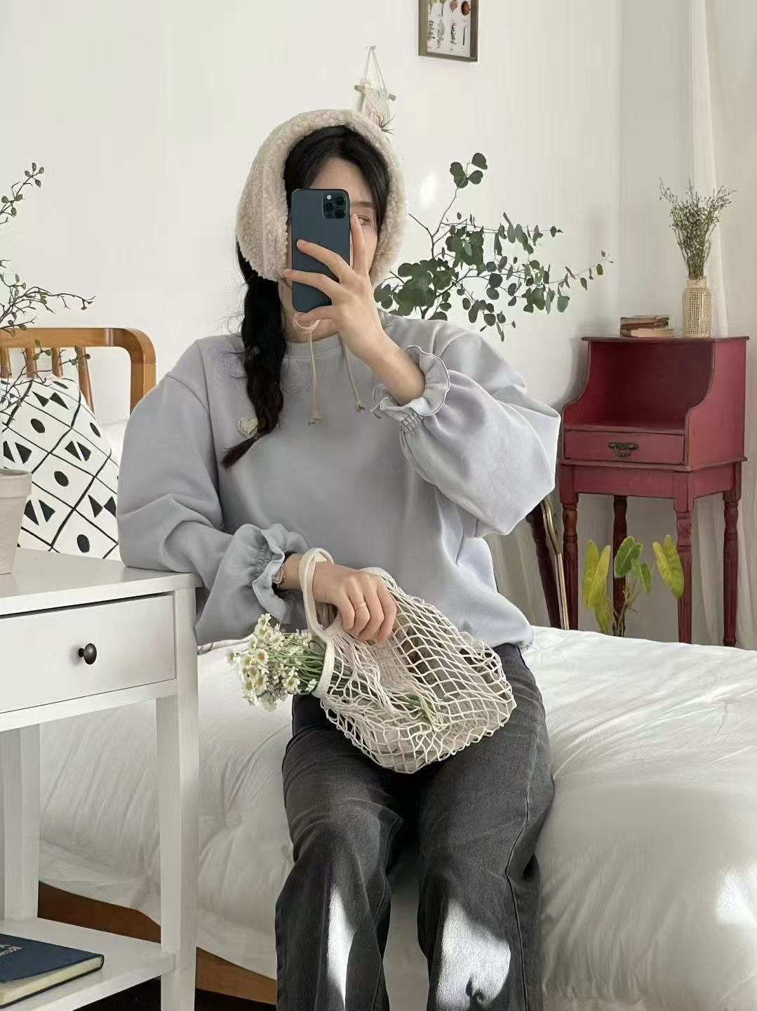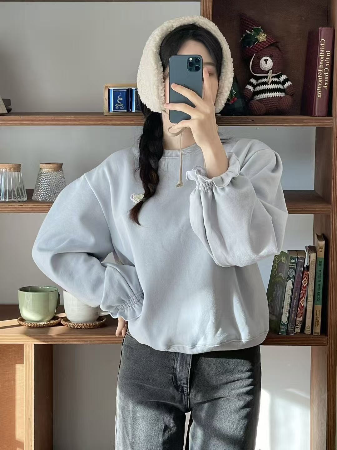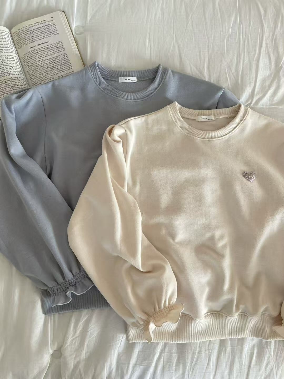 柔軟棉感搭配微澎公主袖剪裁,讓整體多了一點溫柔線條感,小小愛心點綴在胸口,不張揚卻很耐看。版型寬鬆不顯臃腫,單穿舒適、內搭襯衫或高領也很適合。不論是居家、外出散步,或簡單出門喝杯咖啡,都能輕鬆完成一套不費力的穿搭。