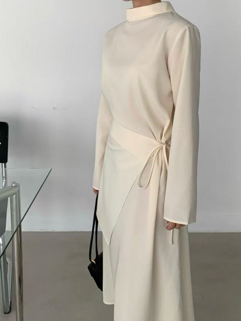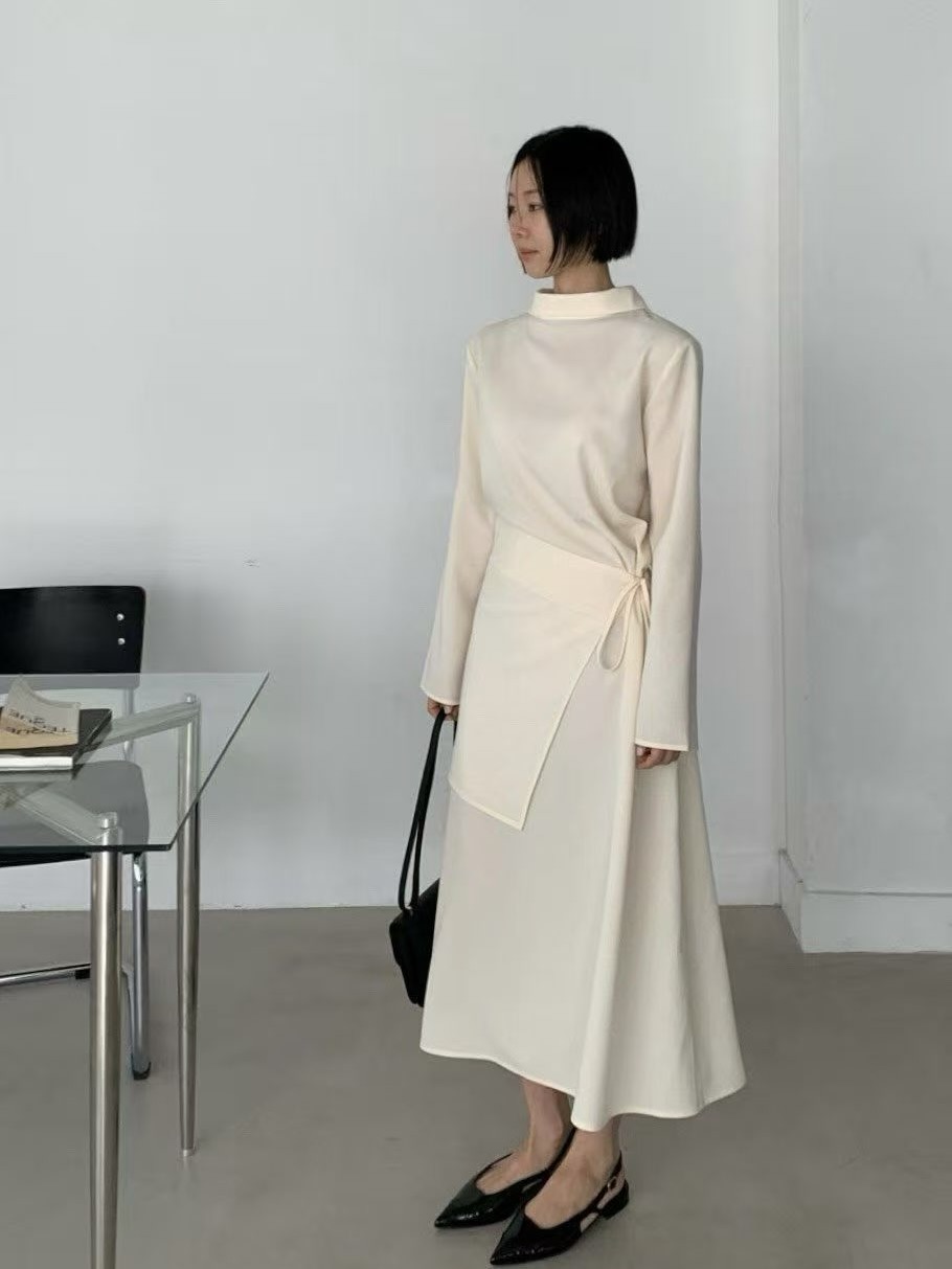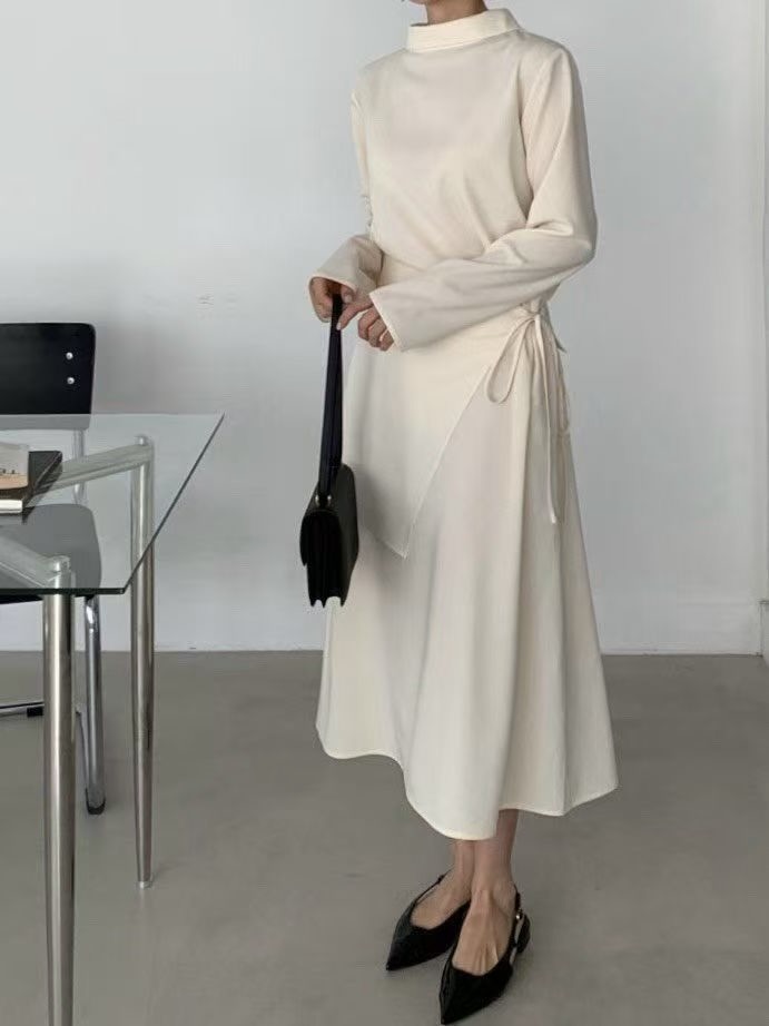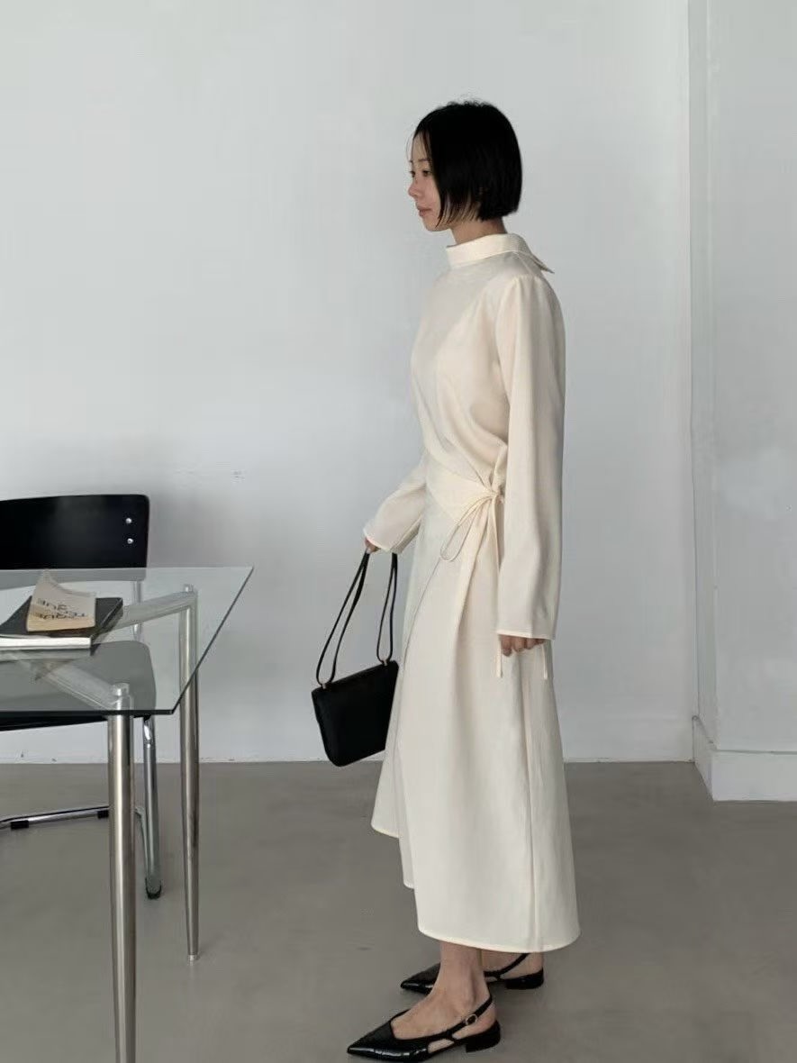 長版洋裝設計,上身線條簡潔,下身加入斜片包覆+側邊綁帶的層次剪裁,讓整體不顯單調,也自然修飾腰腹與下半身比例。版型順身但不貼身,行走時裙擺有垂墜感,視覺線條俐落。立領設計讓上身看起來更乾淨、有精神,袖長偏長,整體風格偏成熟簡約。可單穿完成整套造型,也適合搭配簡單跟鞋或平底鞋,屬於不用多想就能出門的實穿洋裝款。