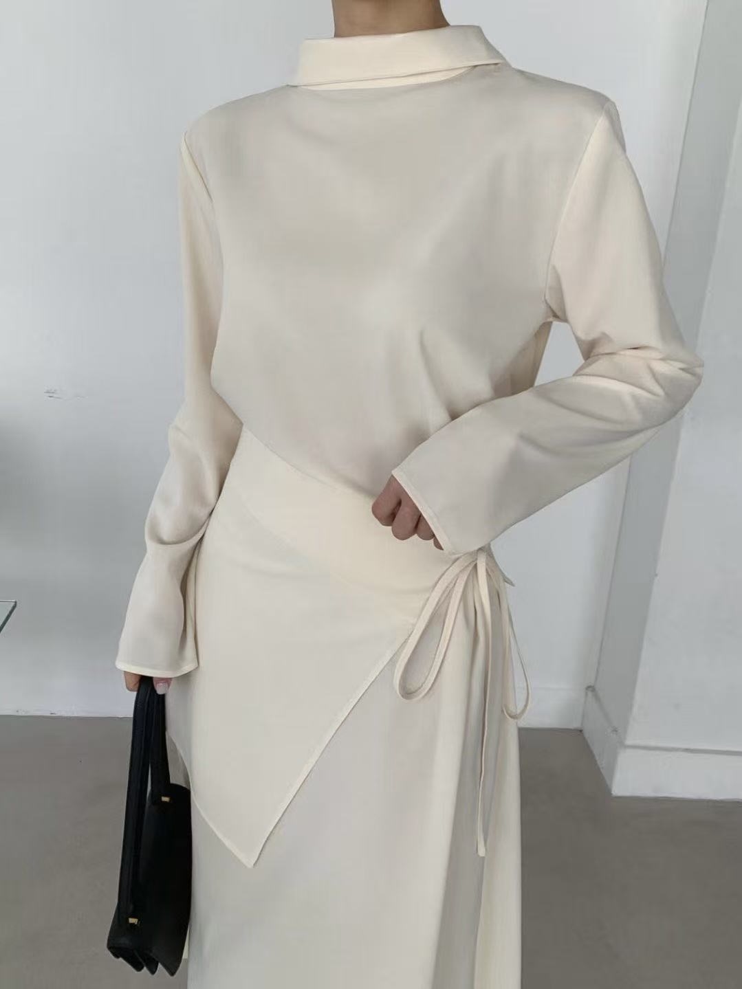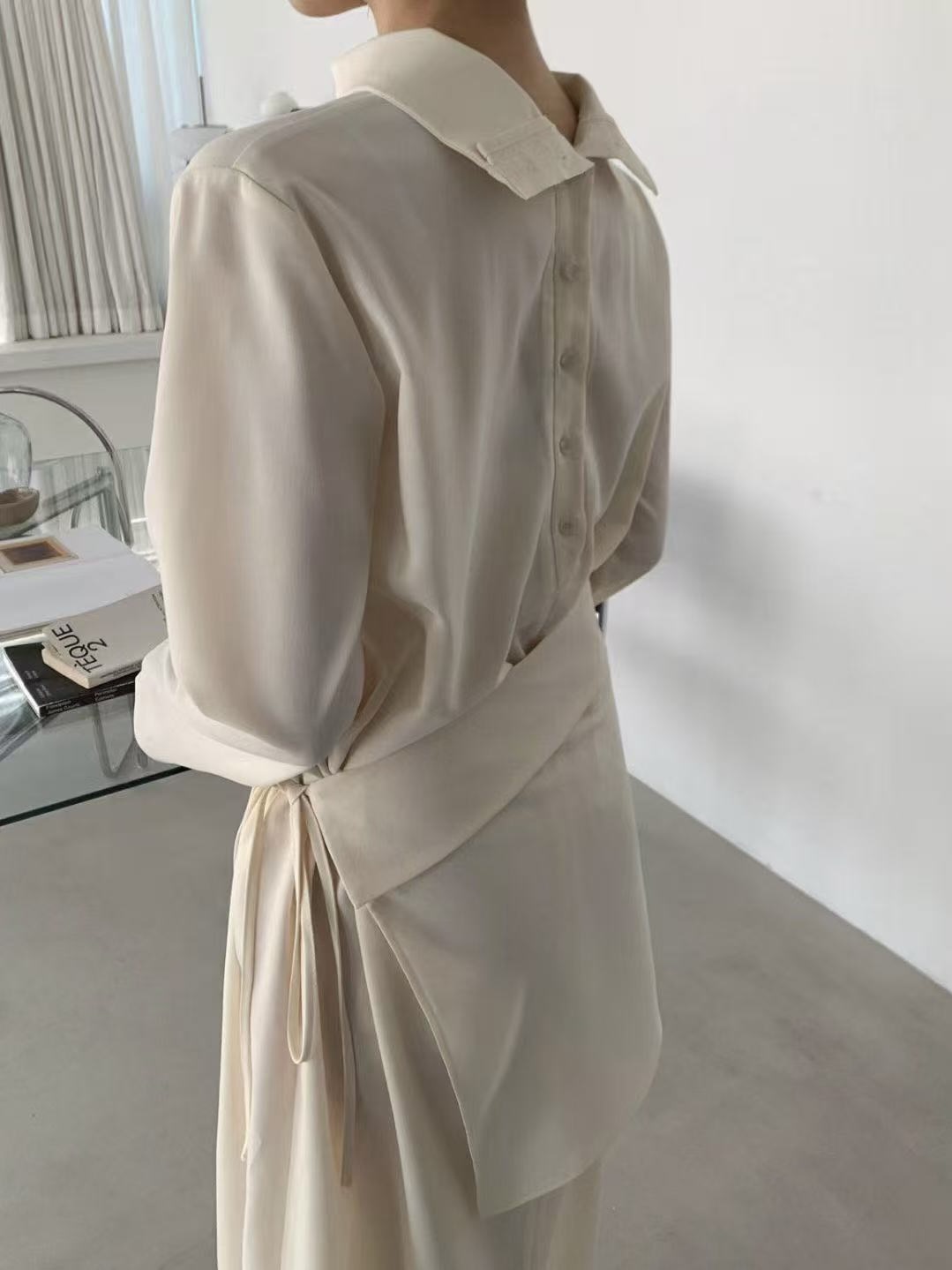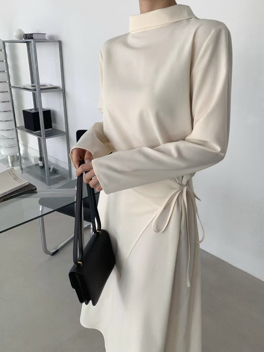 長版洋裝設計,上身線條簡潔,下身加入斜片包覆+側邊綁帶的層次剪裁,讓整體不顯單調,也自然修飾腰腹與下半身比例。版型順身但不貼身,行走時裙擺有垂墜感,視覺線條俐落。立領設計讓上身看起來更乾淨、有精神,袖長偏長,整體風格偏成熟簡約。可單穿完成整套造型,也適合搭配簡單跟鞋或平底鞋,屬於不用多想就能出門的實穿洋裝款。