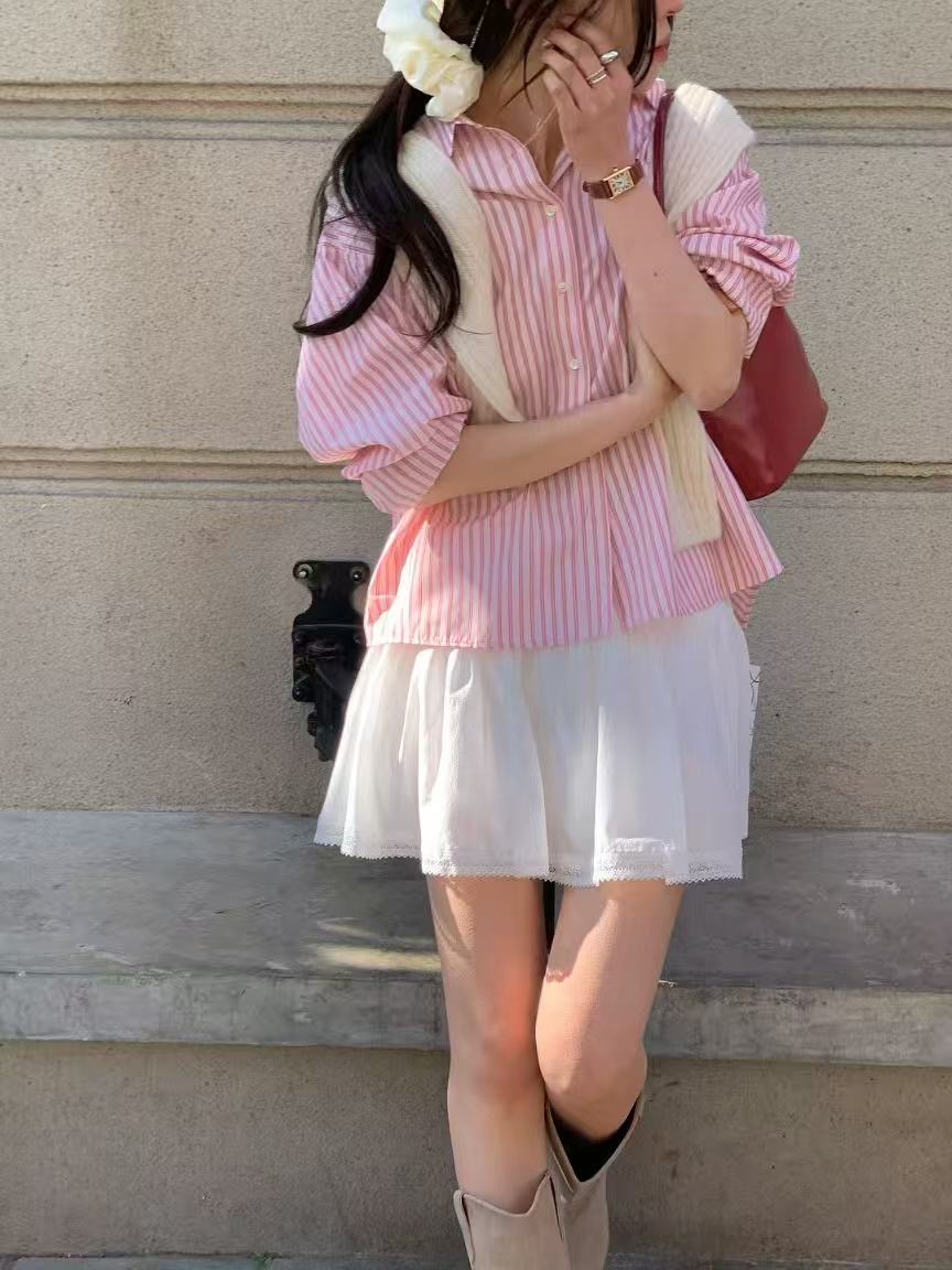 細條紋設計耐看又好搭配,下身可搭短裙、牛仔褲或西裝褲都適合。衣長略偏正常版型,可紮可放,穿搭彈性高,日常單穿清爽俐落,也可當外搭使用,內搭背心或素T都很適合。