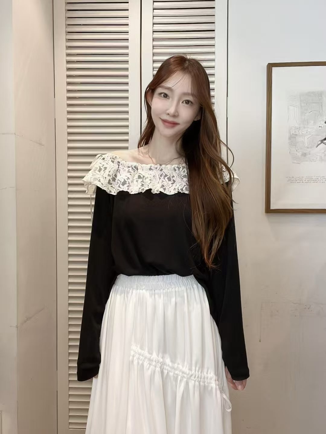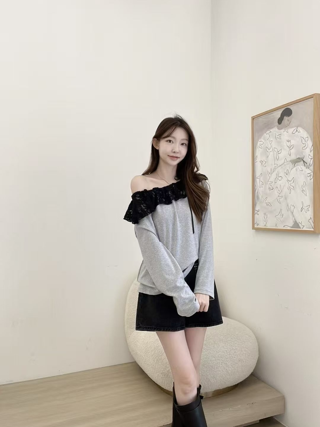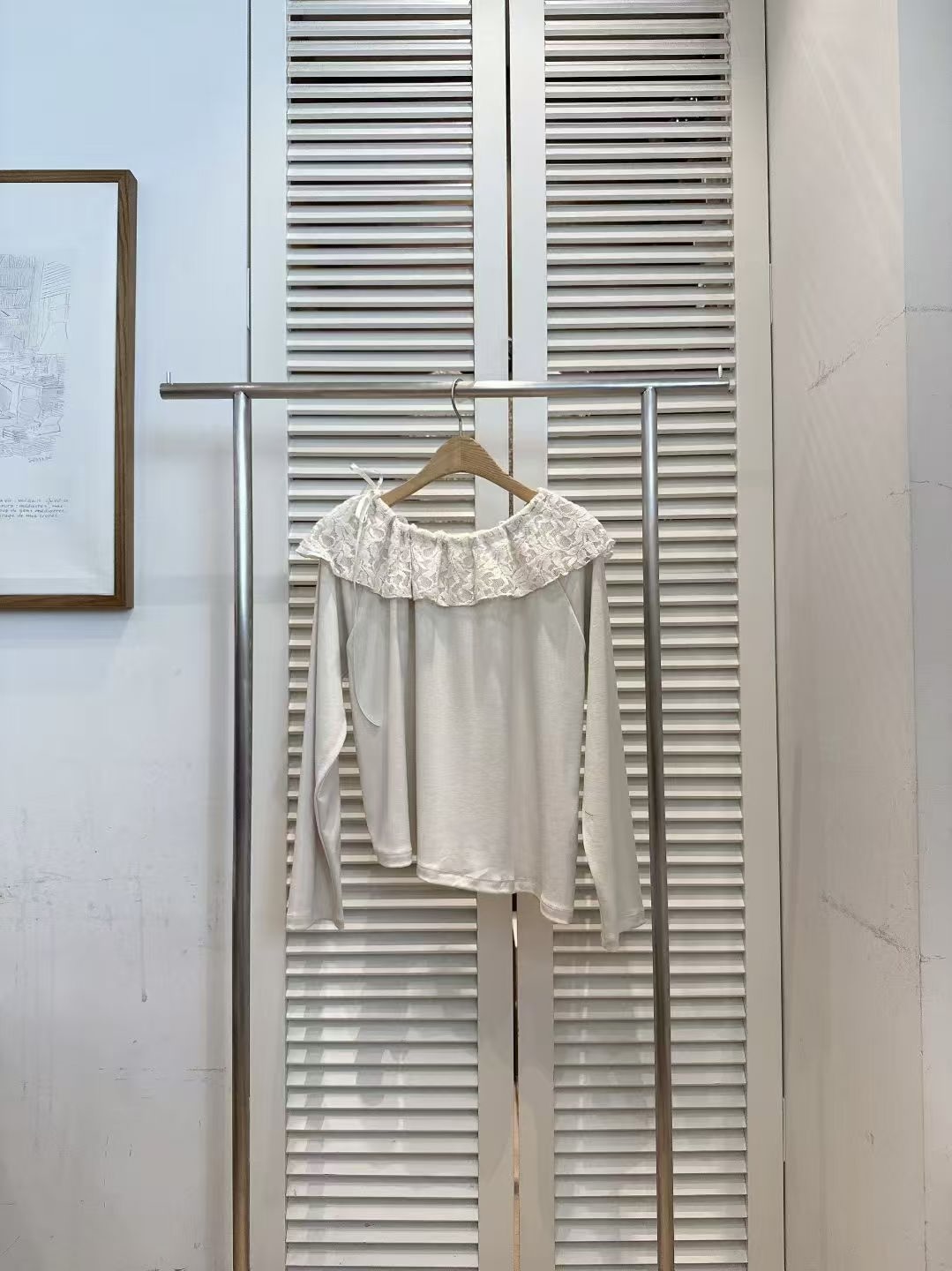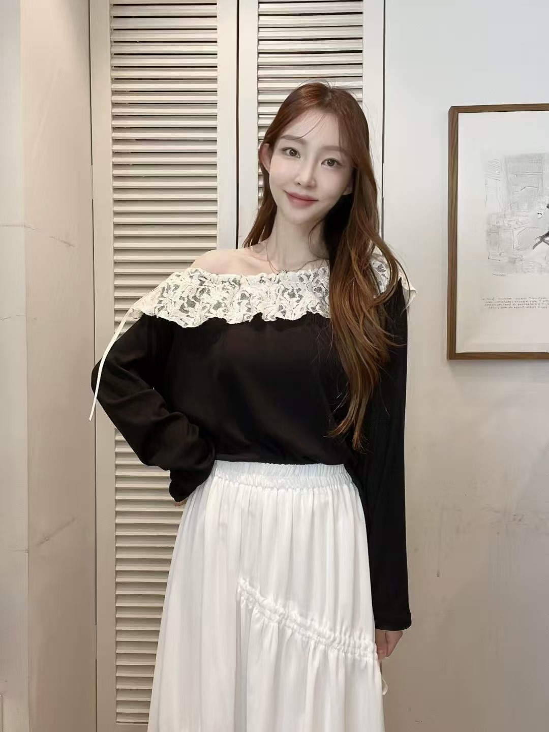 領口蕾絲設計為整體亮點,可自然穿著,呈現溫柔氣質;也可微拉成斜肩或單側露肩造型,增加造型變化與層次感。