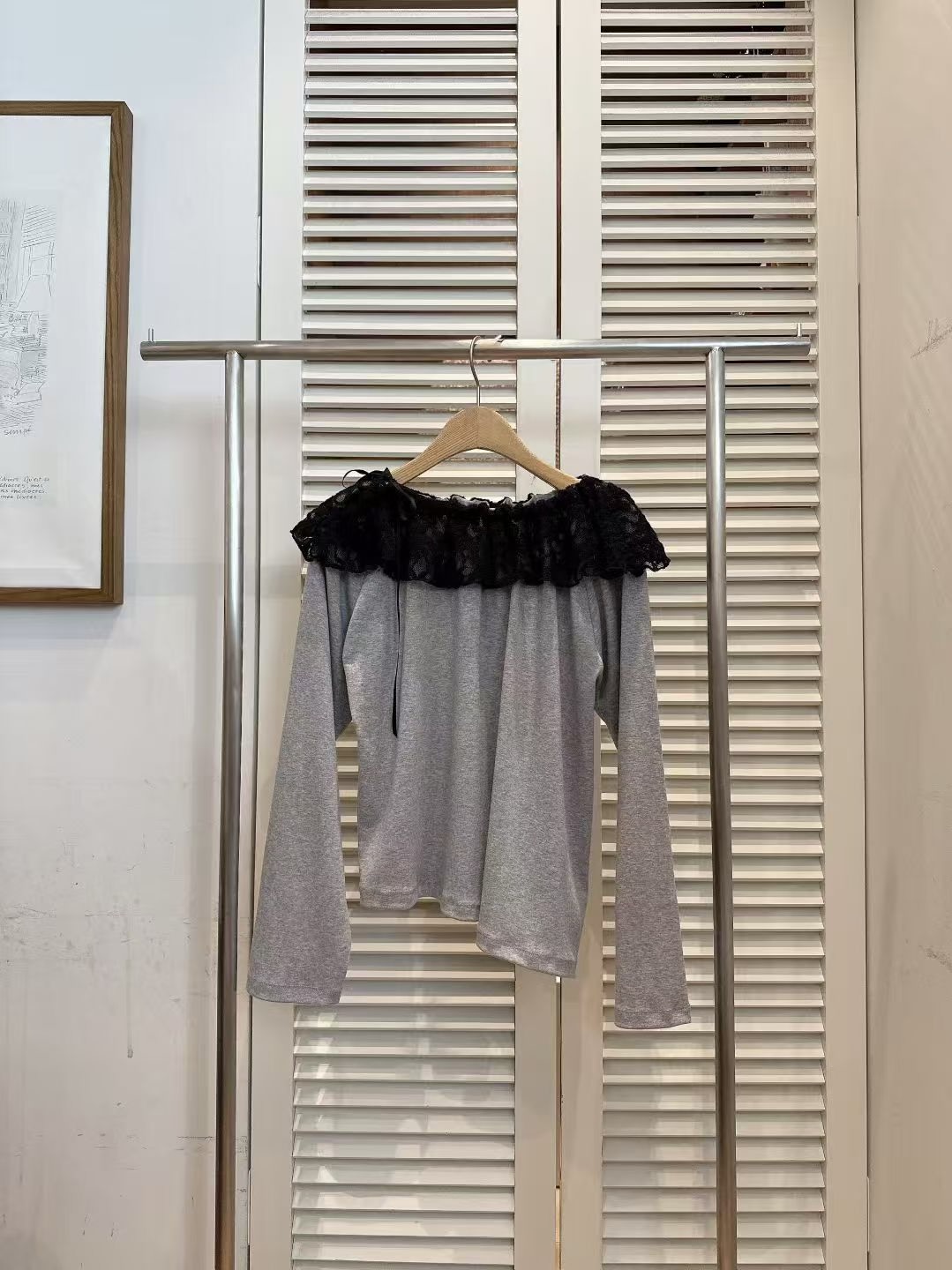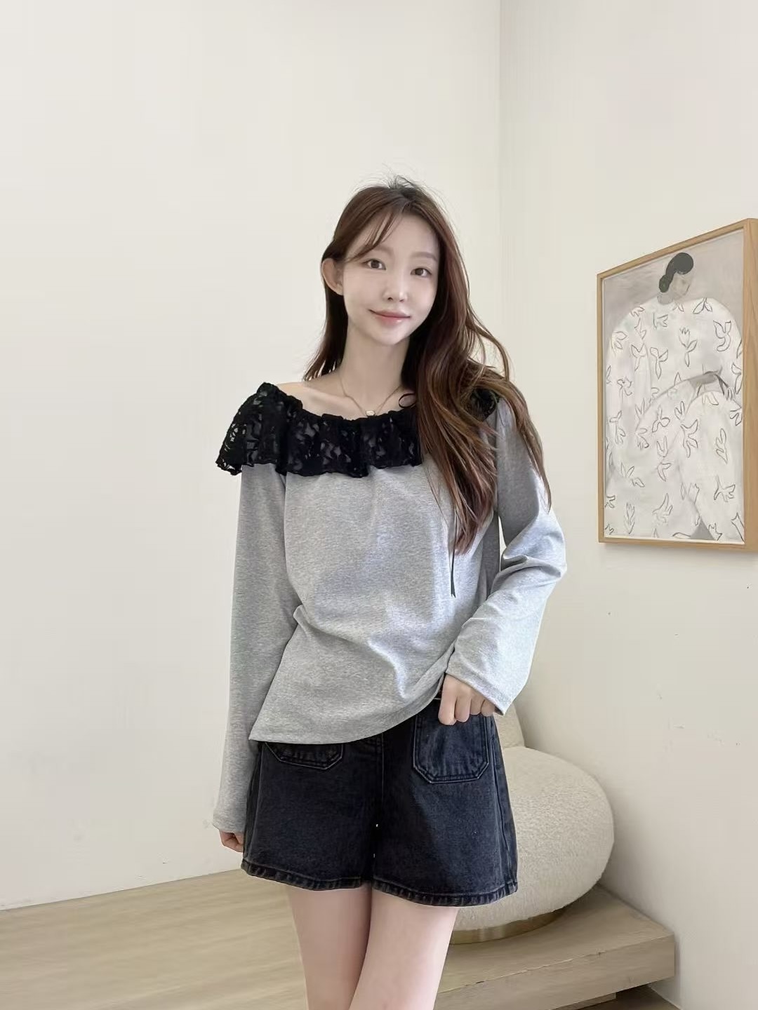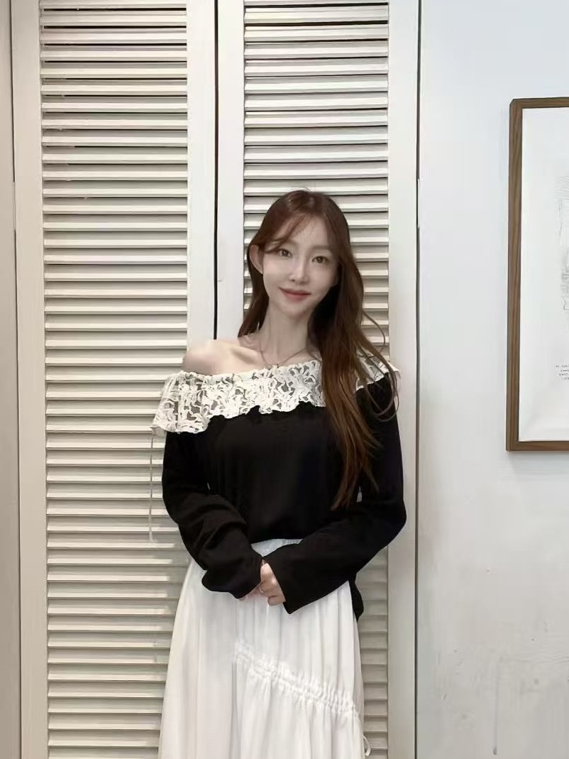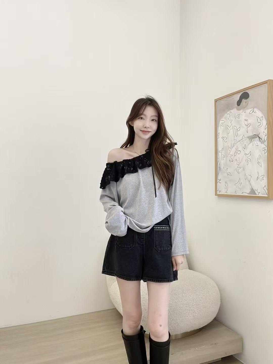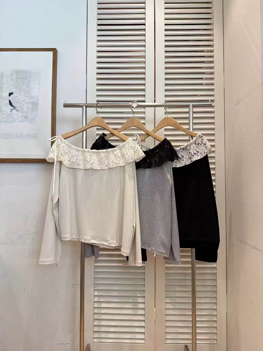 領口蕾絲設計為整體亮點,可自然穿著,呈現溫柔氣質;也可微拉成斜肩或單側露肩造型,增加造型變化與層次感。