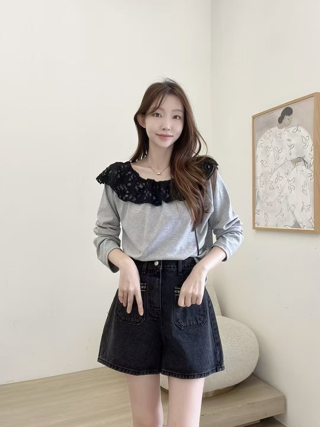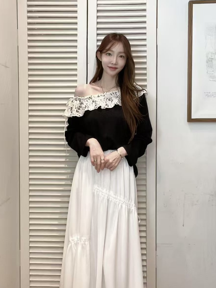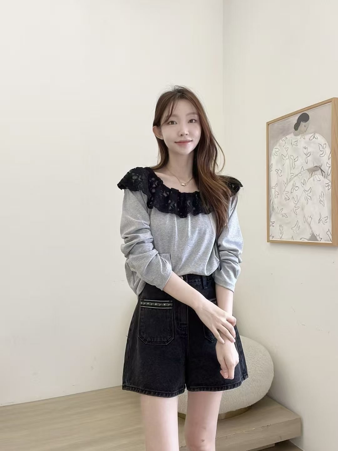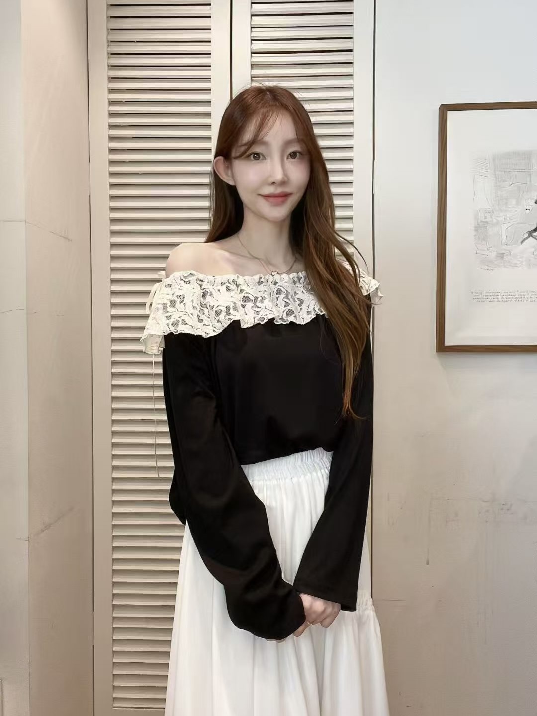 領口蕾絲設計為整體亮點,可自然穿著,呈現溫柔氣質;也可微拉成斜肩或單側露肩造型,增加造型變化與層次感。
