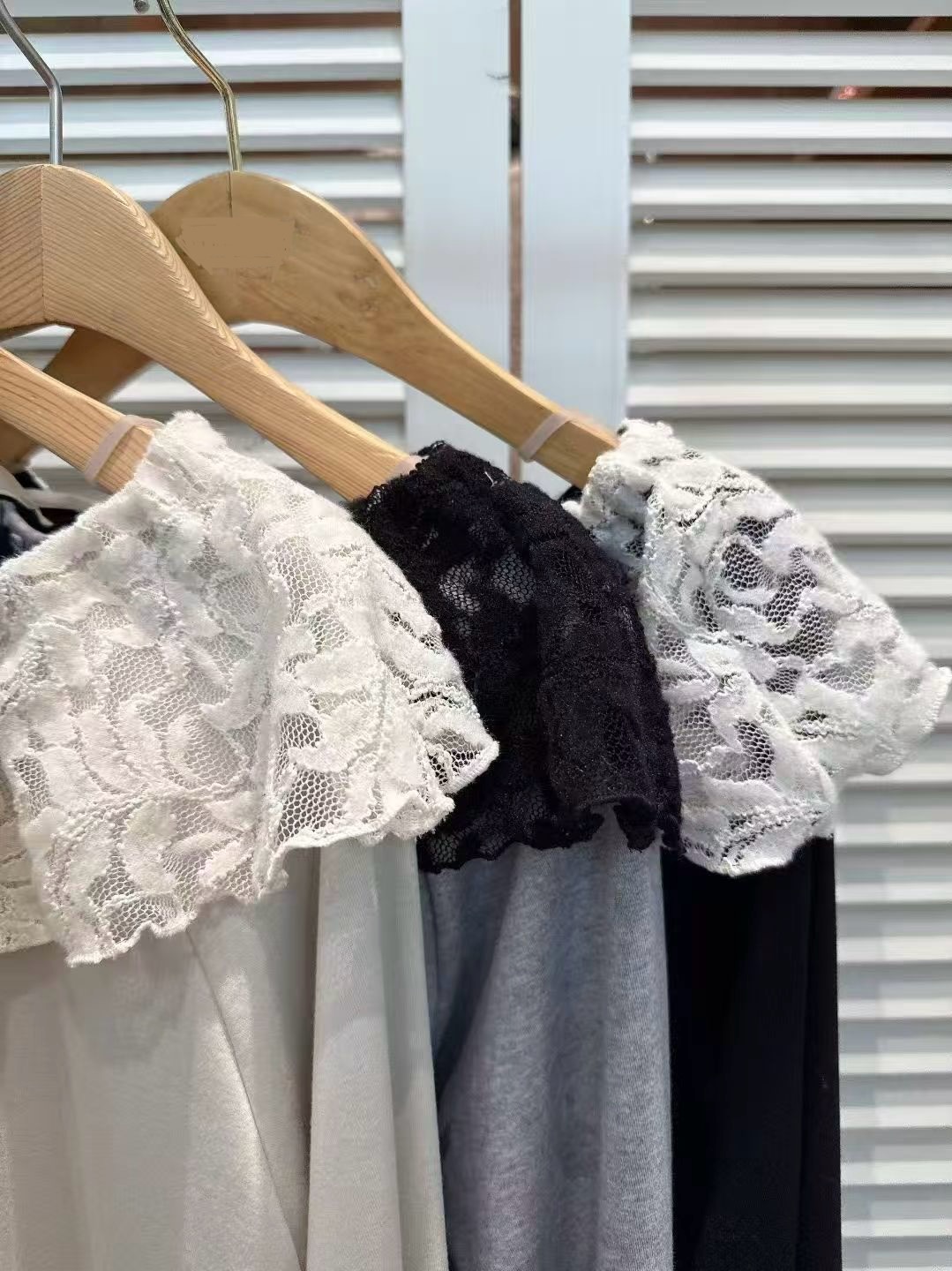 以柔軟面料搭配蕾絲拼接設計,展現優雅與細節感兼具的日常穿搭。
