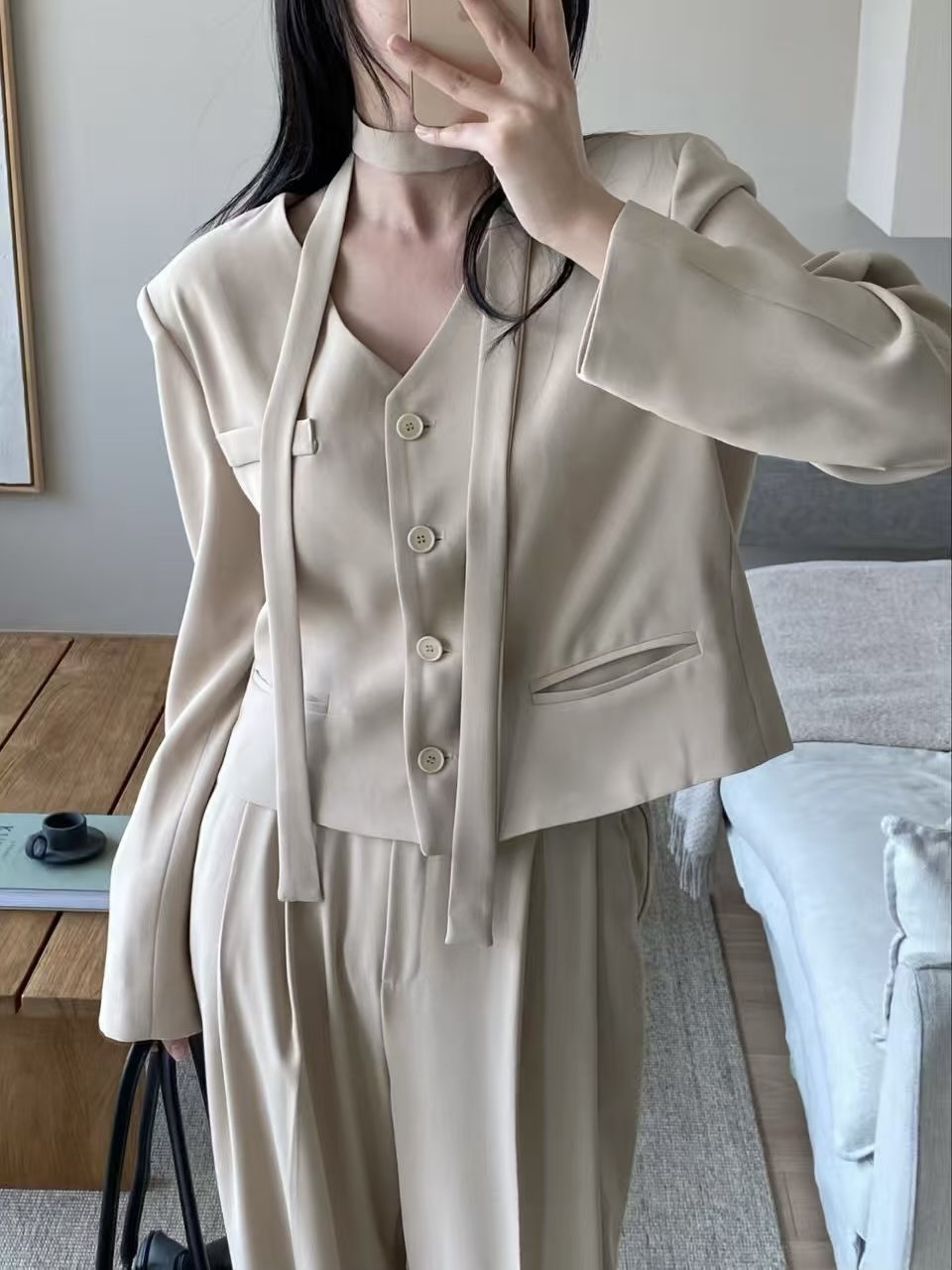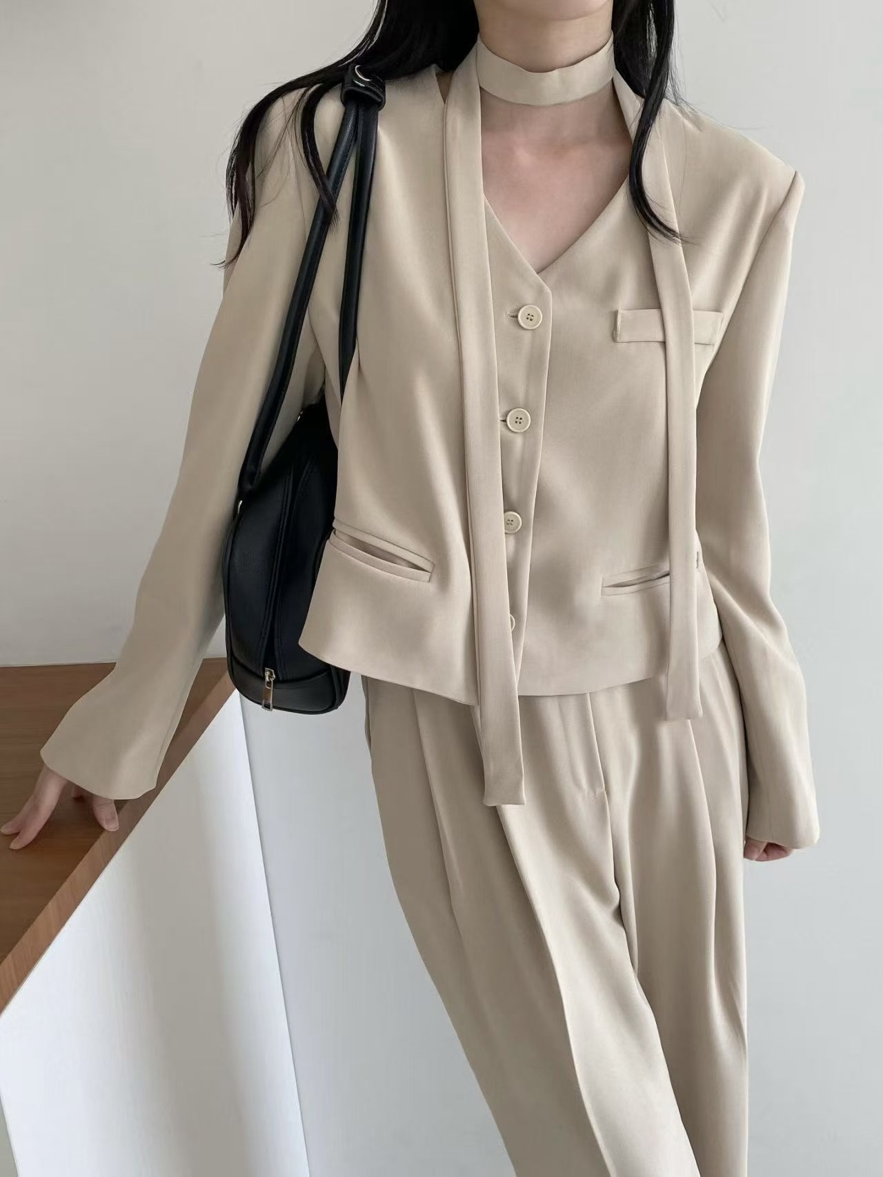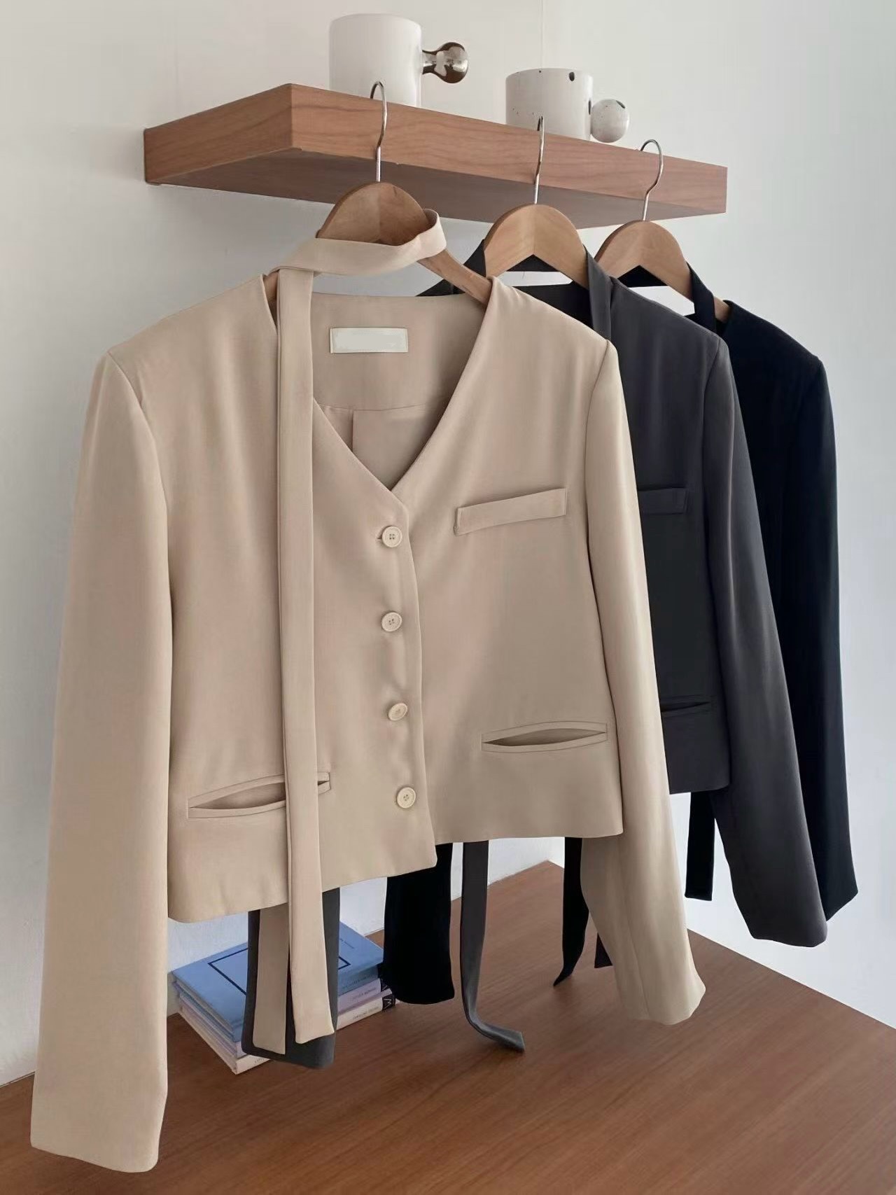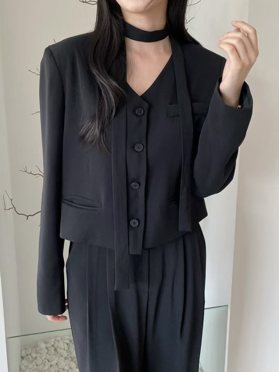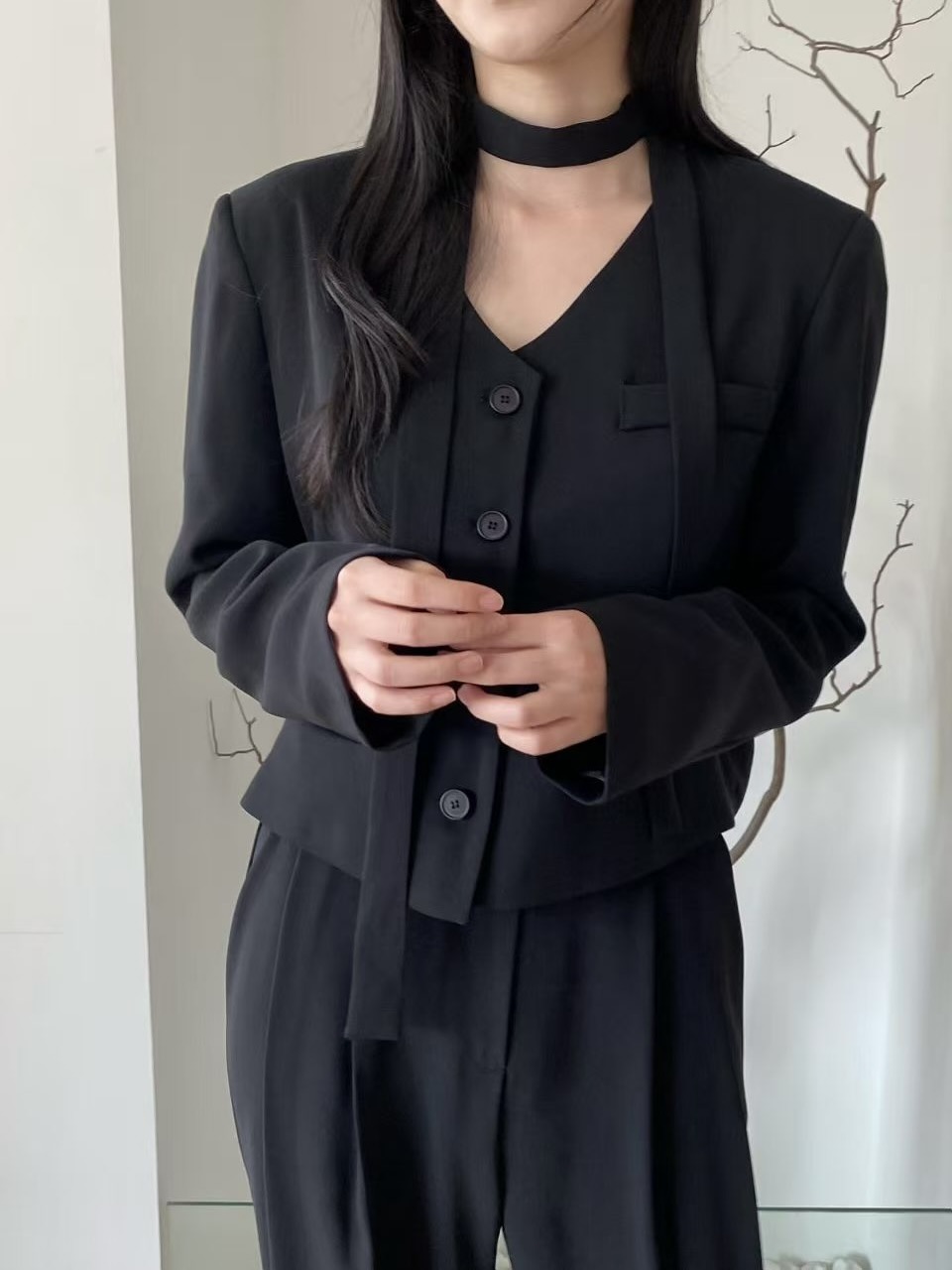 上身為短版西裝外套,線條乾淨利落,領口延伸的綁帶設計可自由調整,增添造型層次與女性柔和感。