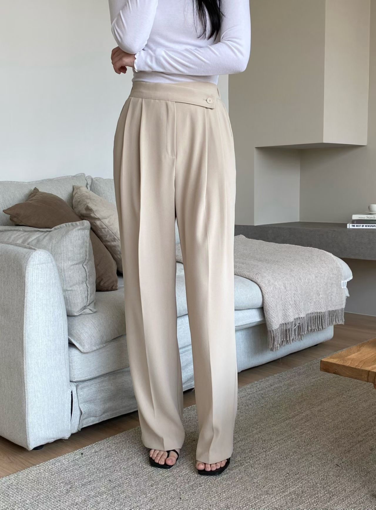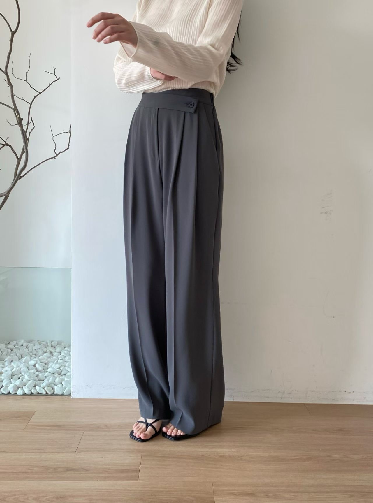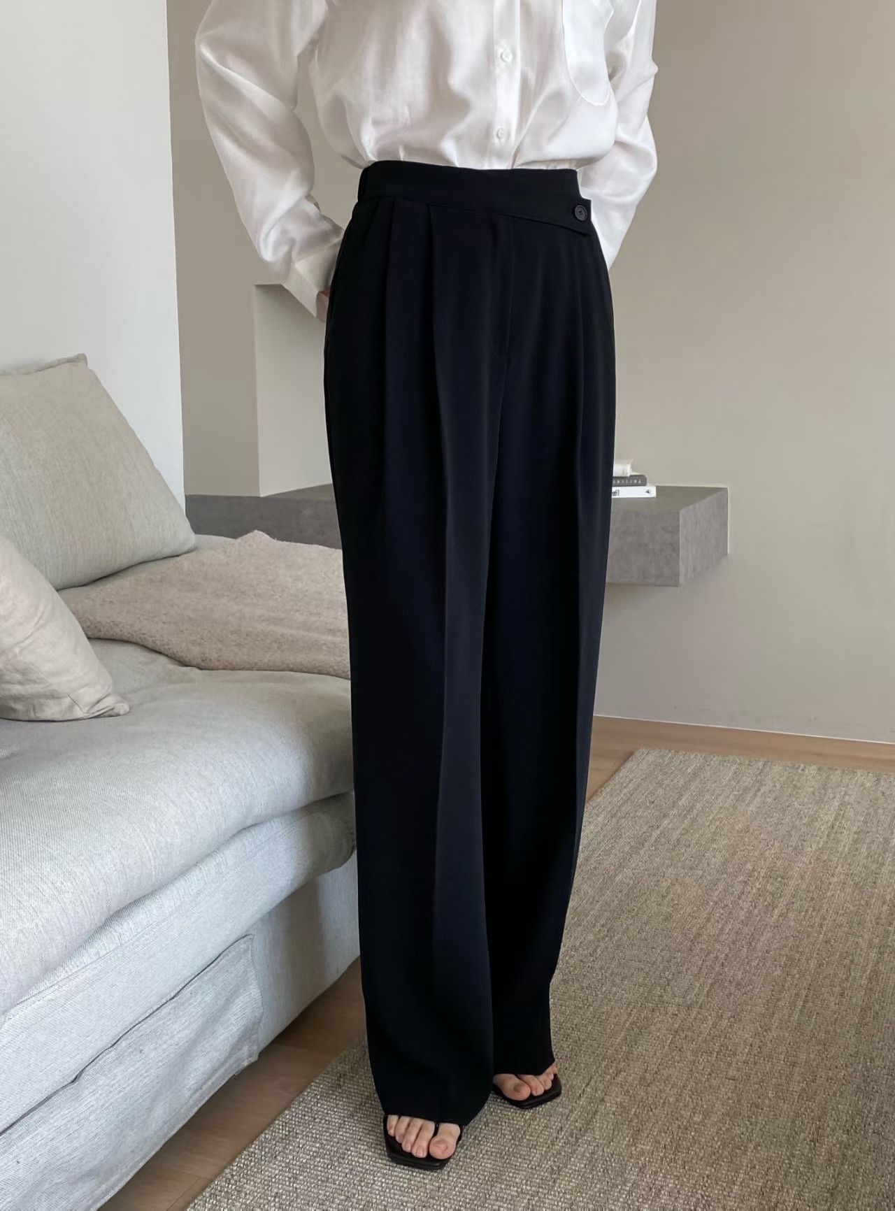 下身長褲採用高腰打褶設計,修飾腰腹比例,版型自然垂墜,讓整體線條更顯修長。