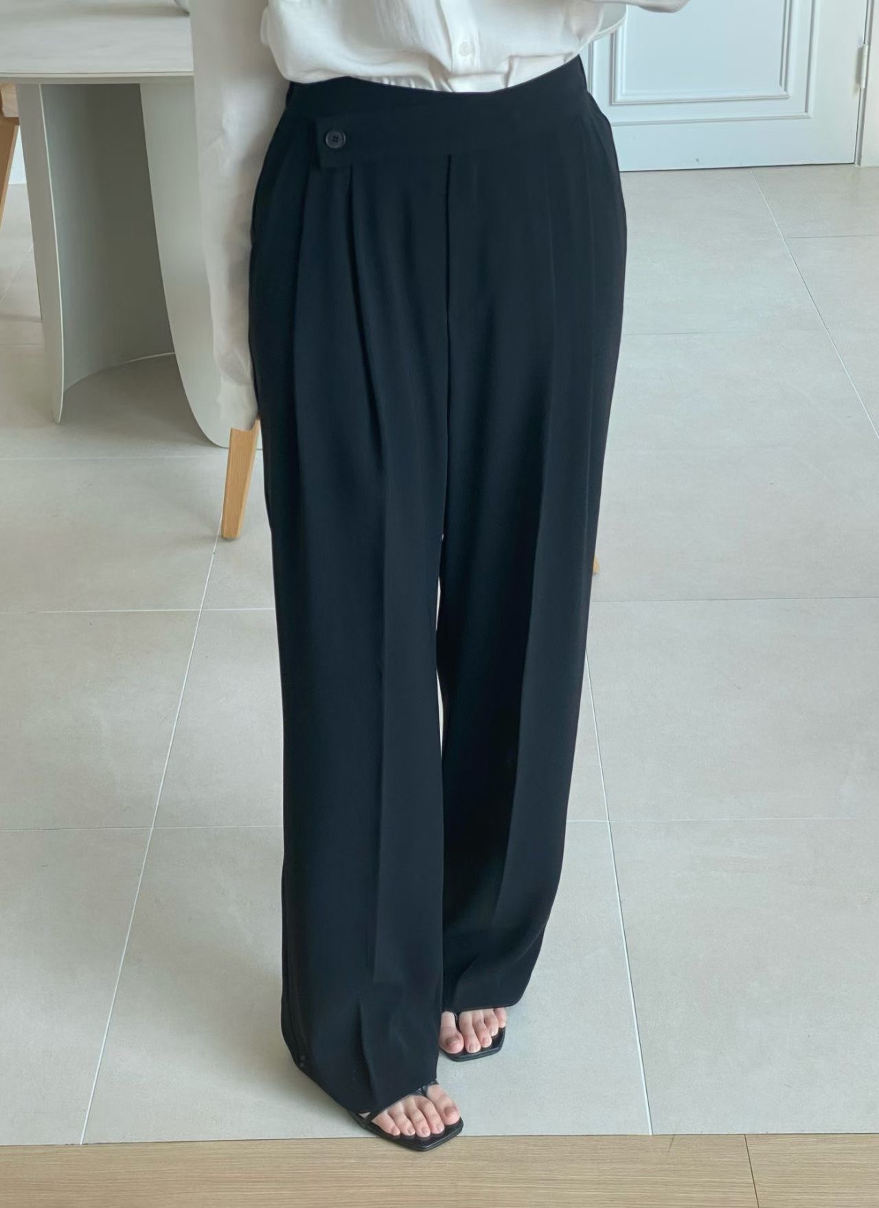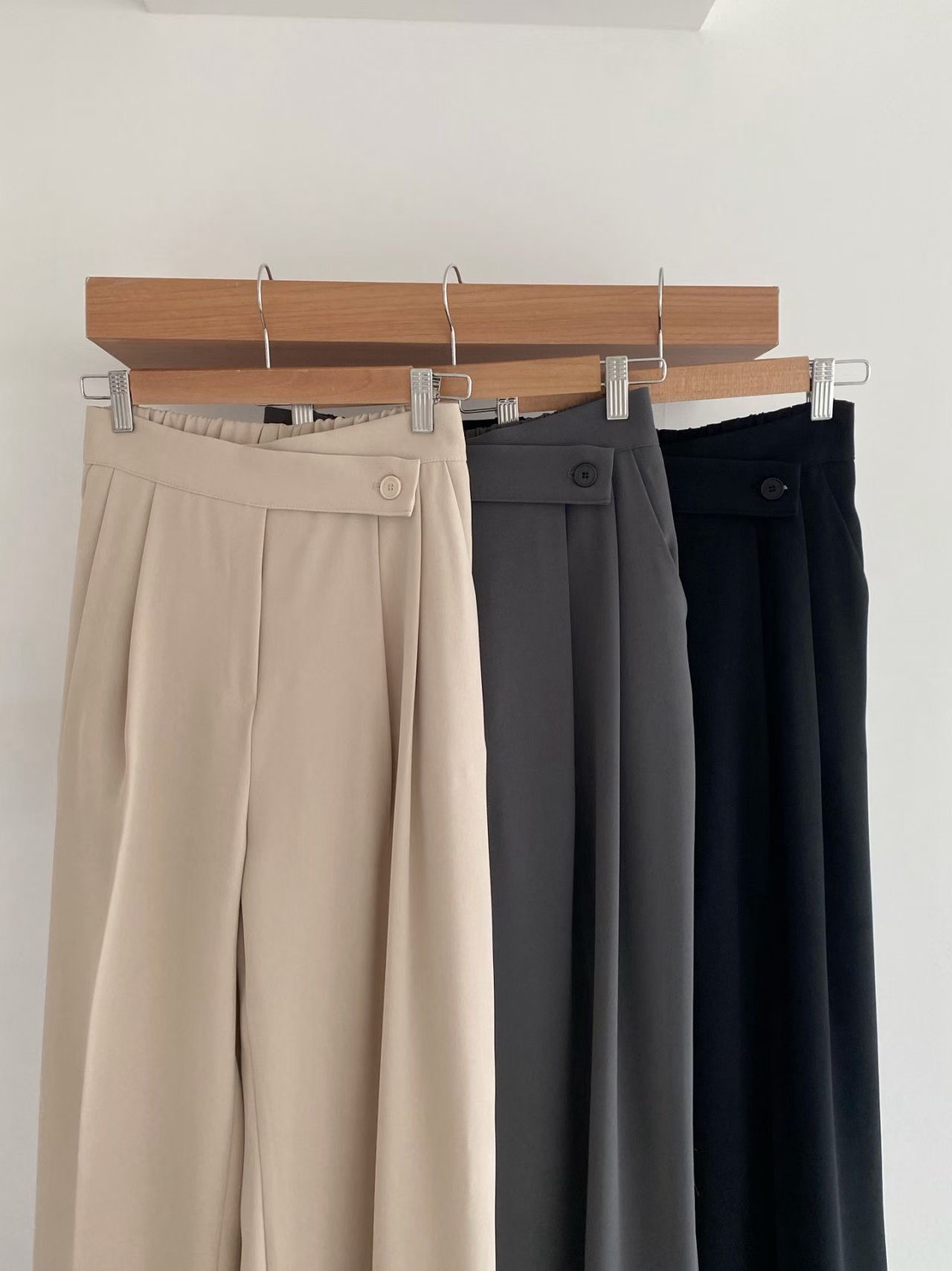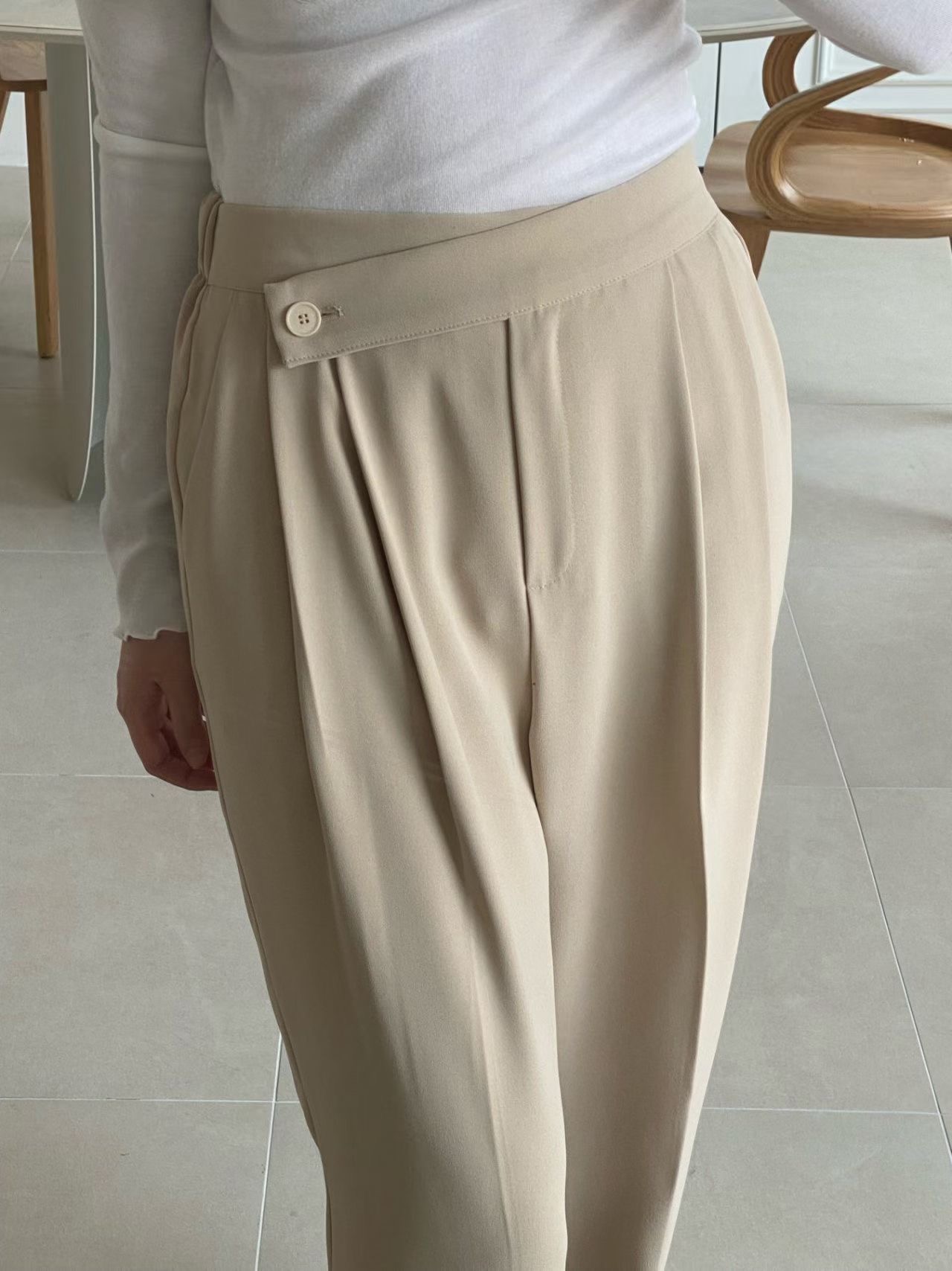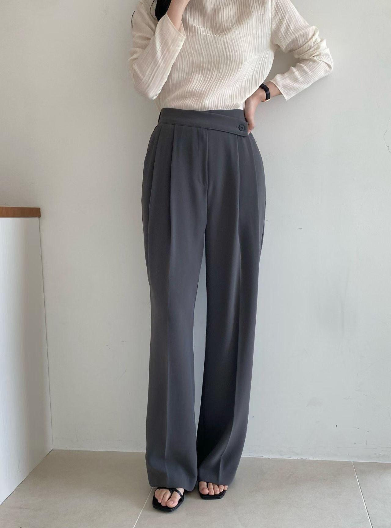 下身長褲採用高腰打褶設計,修飾腰腹比例,版型自然垂墜,讓整體線條更顯修長。