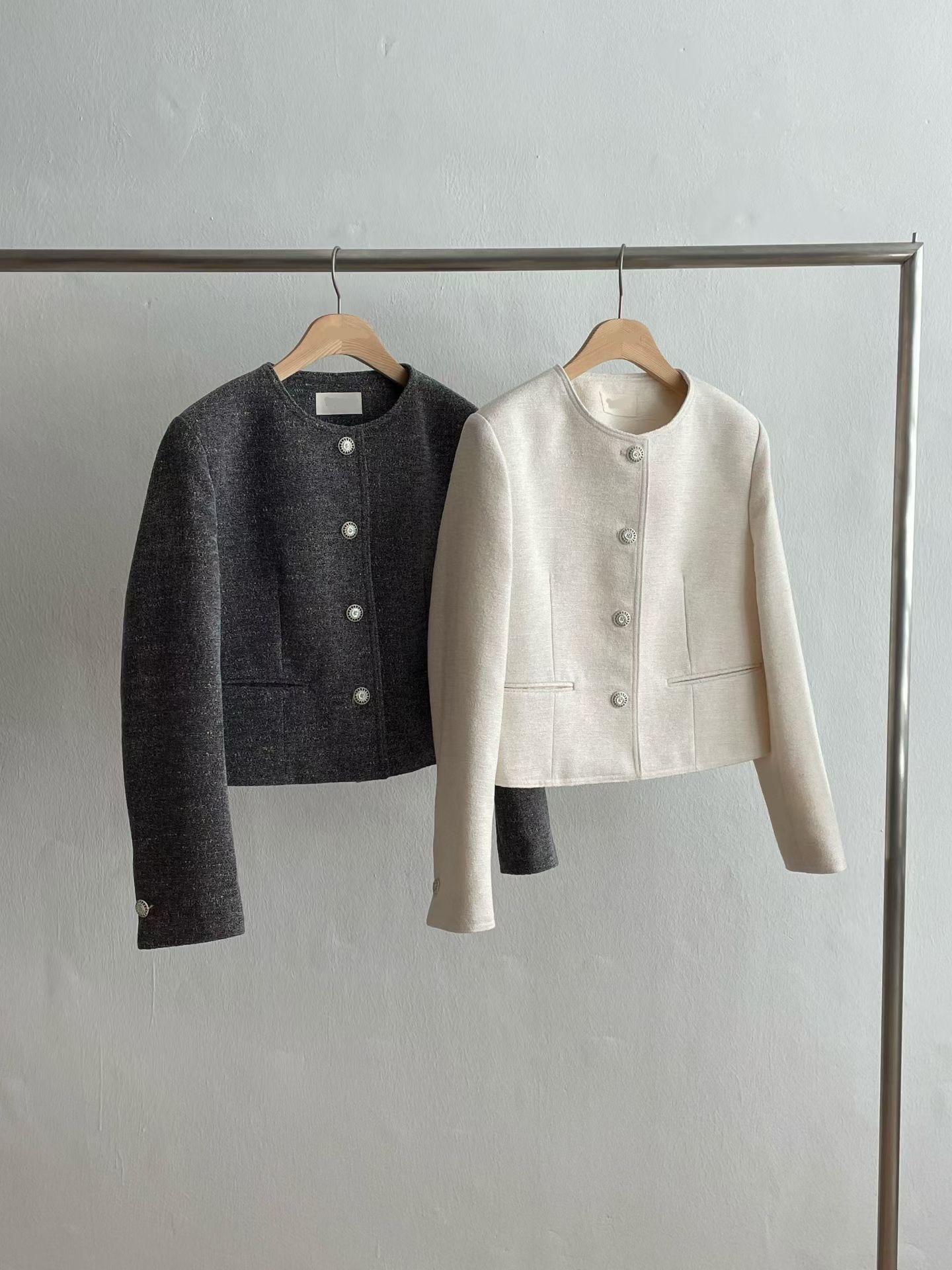 俐落優雅的無領設計,搭配亮眼雕花金屬釦,簡約中散發法式復古韻味。